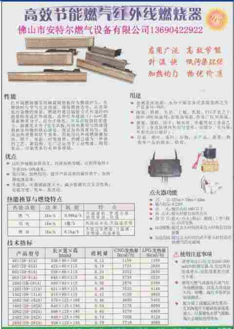 不锈钢红外线燃烧器运用的科学技术设计制作而成。燃气在燃烧时与空气充分预混,使得燃气充分燃烧,从而降低污染;它燃烧时辐射的红外线具有较强穿透力,能将热量均匀渗透到被加热物的核心,保证加热效果均匀,提高加热质量和烘干效率,是环保节能的产品。