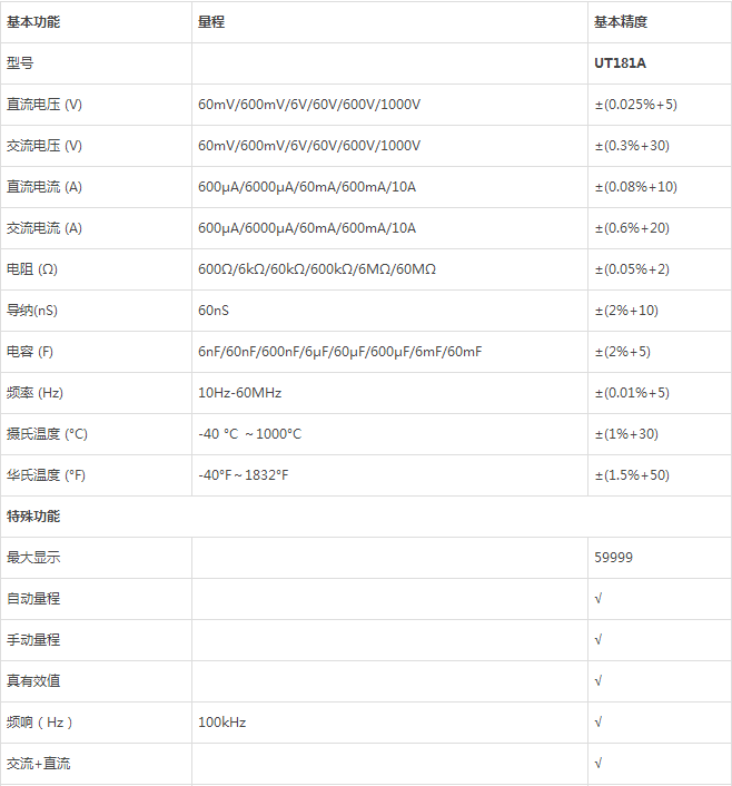 UT181A真有效值数据记录万用表咨询热线由北京英业华科技代理UT171B工业真有效值万用表 UT181A是一款具备真有效值,OLED显示, Li-ion电池供电,4-20mA回路测试,AC+DC测量,nS电导测量,全量程保护,可编程方波输出,LoZ低阻抗输入,VFC变频测量,模拟条显示,USB/蓝牙通讯功能,数据存储功能的4 6/5位工业级真有效值数字万用表。适合用于工业应用,电机故障排除,电气工程维修人员的一款功能齐全的检验仪表。