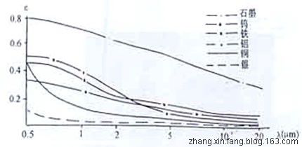 图三是石墨和一些金属材料的发射率曲线。它们在短波区域发射率较高,因此应选择短工作波长测温。应注意图中给出的是未经氧化时的数据,实际加工过程中它们的表面将被氧化,发射率将显著提高。