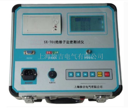 SX-701绝缘子盐密测试仪是上海徐吉电气有限公司生产销售SX-701绝缘子盐密测试仪,a)具有量程自动切换功能。 b)测量范围大,盐密范围0.0001mg/cm2~9.9999mg/cm2。 c)自动进行温度补偿,直接显示20℃时的标准电导率和等值附盐密度(ESDD)。 d) 对使用电导率大于10μs/cm的清洗液,具有自动祛除清洗液自身电导率和原始含盐量的功能。降低了对清洗液的要求。 e) 通过带电修正系数,自动将不带电测量的盐密度(ESDD)转换为带电测量的盐密度(ESDD)。 f)具有存储/打印/数据上传功能,可存储400组数据。 g)内置大容量充电锂电池,适合野外现场使用。