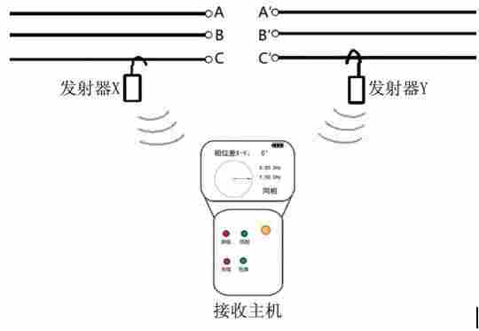 两相近距离核相原理:X、Y发射器采样高压线路频率和相位信息,并将采样信息通过无线电波发送给主机,主机显示线路频率和XY相位差值。如果X->Y=0°,则为同相;X->Y=120°/240°,则为异相。