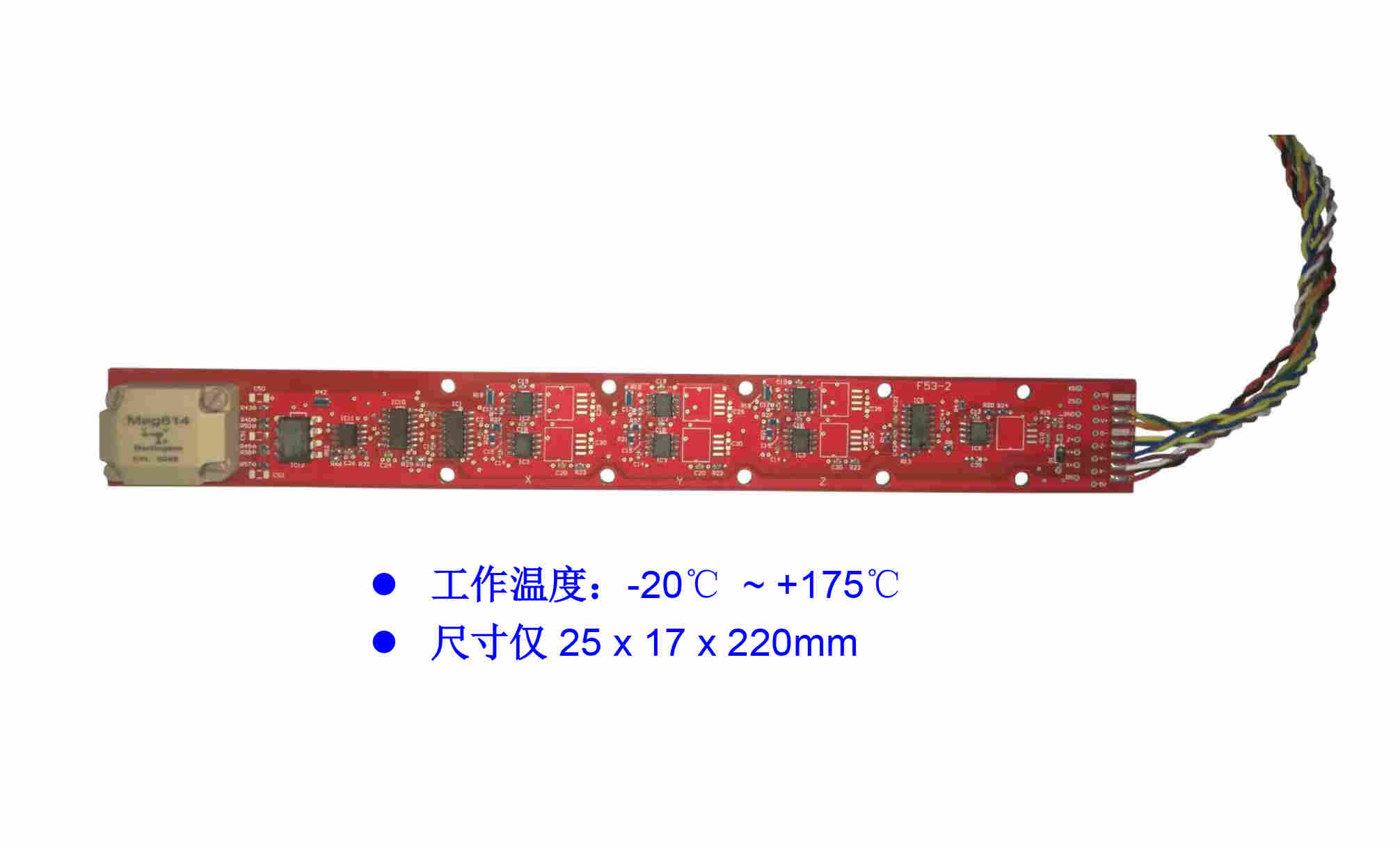 F53 高温型三维磁通门传感器按照工业标准设计,将磁场强度直接转换成模拟信号(±10V);尺寸紧凑(仅 25 x 17 x 220mm),可安装于小尺寸探管,易集成到井下/钻井探测设备及系统中。