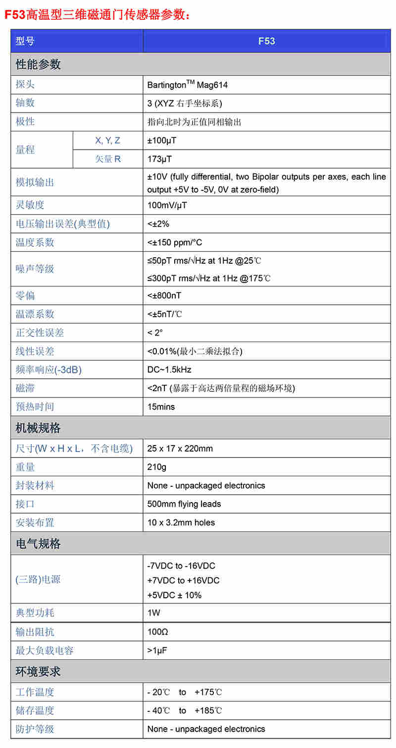 F53 高温型三维磁通门传感器量程±100μT,频率响应 DC-1.5kHz;此外, F53还具有良好的线性度(<0.01%)、正交性(<2°)和噪声特性(≤300pTrms/√Hz at 1Hz@175℃)。