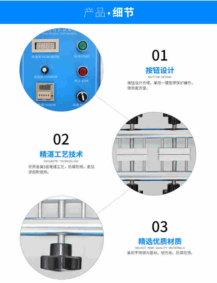 二、测试方法:是将试料固定在夹具上,并加一定荷重,试验时夹具左右摆动,经一定次数后,检视其断线率;或至无法通电时,查看其计摆动次数。本机能自动计数,试料弯折至断线无法通电时,并能自动停机。