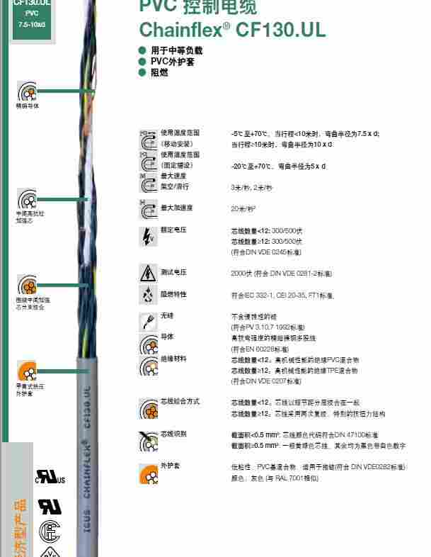 igus Chainflex高柔性控制电缆的优点:适用于拖链的Chainflex高柔性控制电缆是弯曲半径小的电缆。 igus控制电缆在拖链中经过了几百万次循环测试。 供选择的产品有PVC控制电缆、PUR控制电缆和TPE控制电缆。Chainflex高柔性控制电缆通过了各种标准与:UL、CSA、CE Desina。其还有阻燃和耐油型电缆。igus控制电缆适用于高速与加速应用,且某些类型可扭曲。除耐有机油或无卤素型外,另有抗紫外线或适用于高温或极低温的电缆可供选择。屏蔽和无屏蔽型控制电缆都可具有这些不同特性。