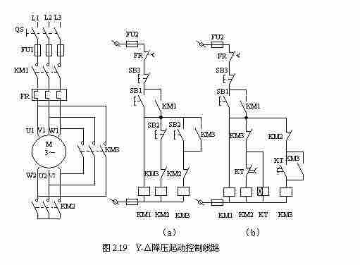 图 2.19 ( b )为时间继电器自动控制 Y —△降压起动控制线路,电路的工作原理为:按下起动按钮 SB1 , KM1 、 KM2 得电吸合,电动机星形起动,同时 KT 也得电,经延时后时间继电器 KT 常闭触头打开,使得 KM2 断电,常开触头闭合,使得 KM3 得电闭合并自锁,电动机由星形切换成三角形正常运行。