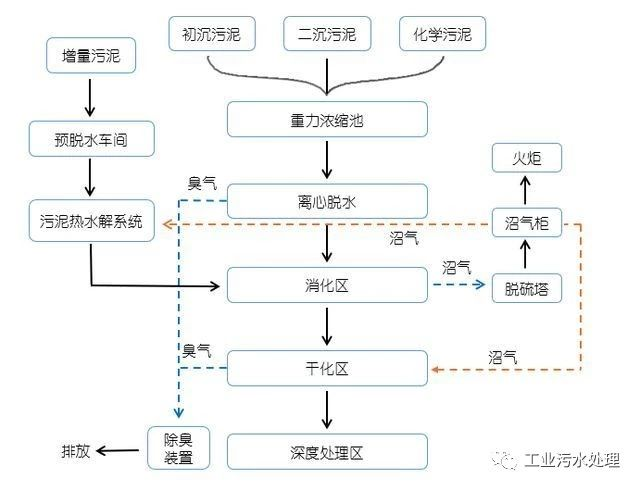 污水处理过程产生的剩余污泥首先通过重力和机械作用降低含水率,然后进入污泥厌氧消化系统使污泥中的部分有机物降解并产生沼气。一部分厌氧消化污泥进入板框压滤机,使含水率降至60%以下;另一部分厌氧消化污泥则通过离心脱水使含水率降至80%以下,然后进入硫化床干化使含水率低于10%,经深度脱水和干化后的污泥外运填埋。