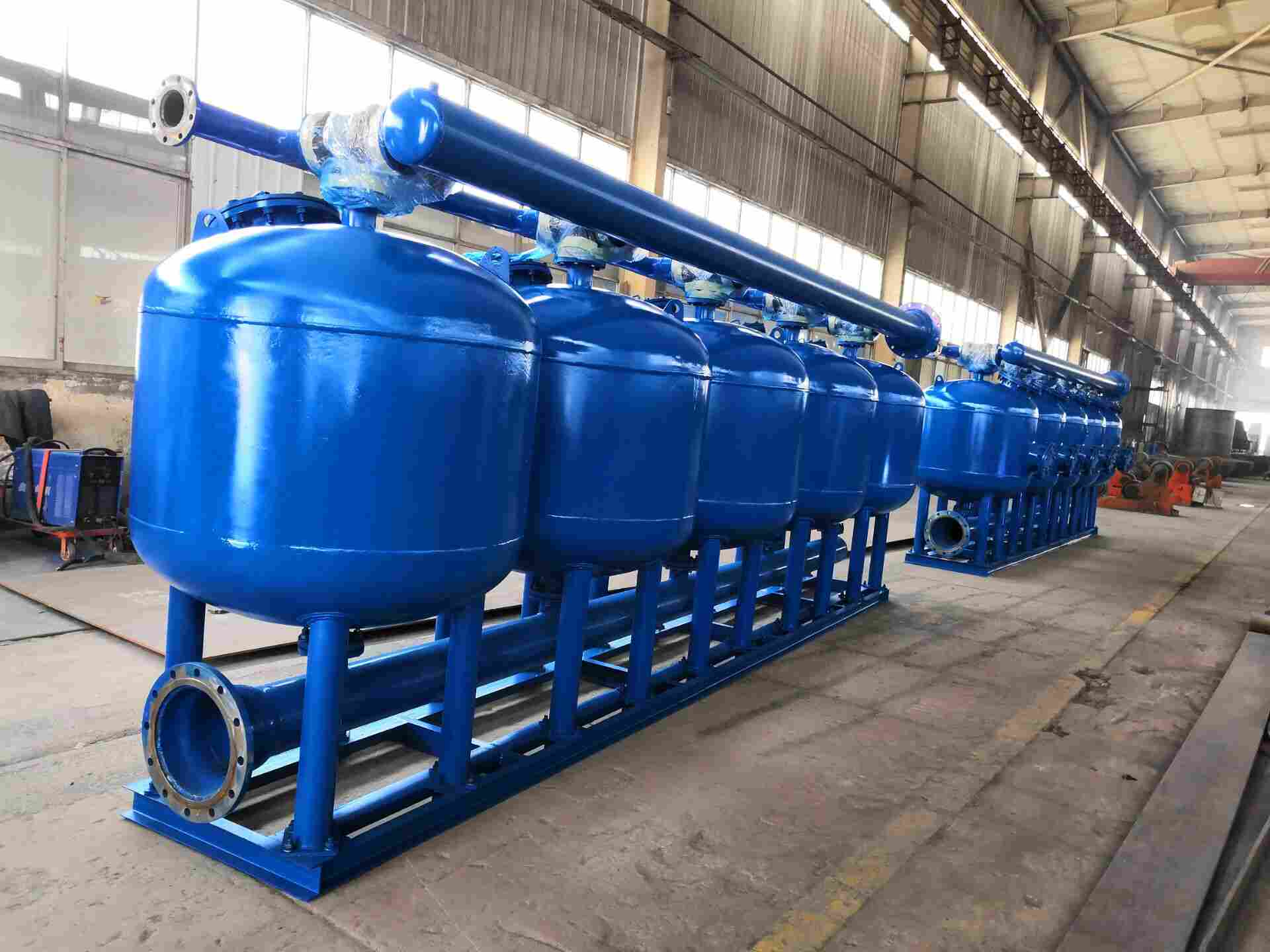 浅层砂过滤器是由多个标准高速砂缸单元组成,内部设有的布水器和集水器,拥有的双向自动冲洗阀,可实现在正常系统运行中多个标准高速砂缸逐个单独的反冲洗,全自动程序控制。