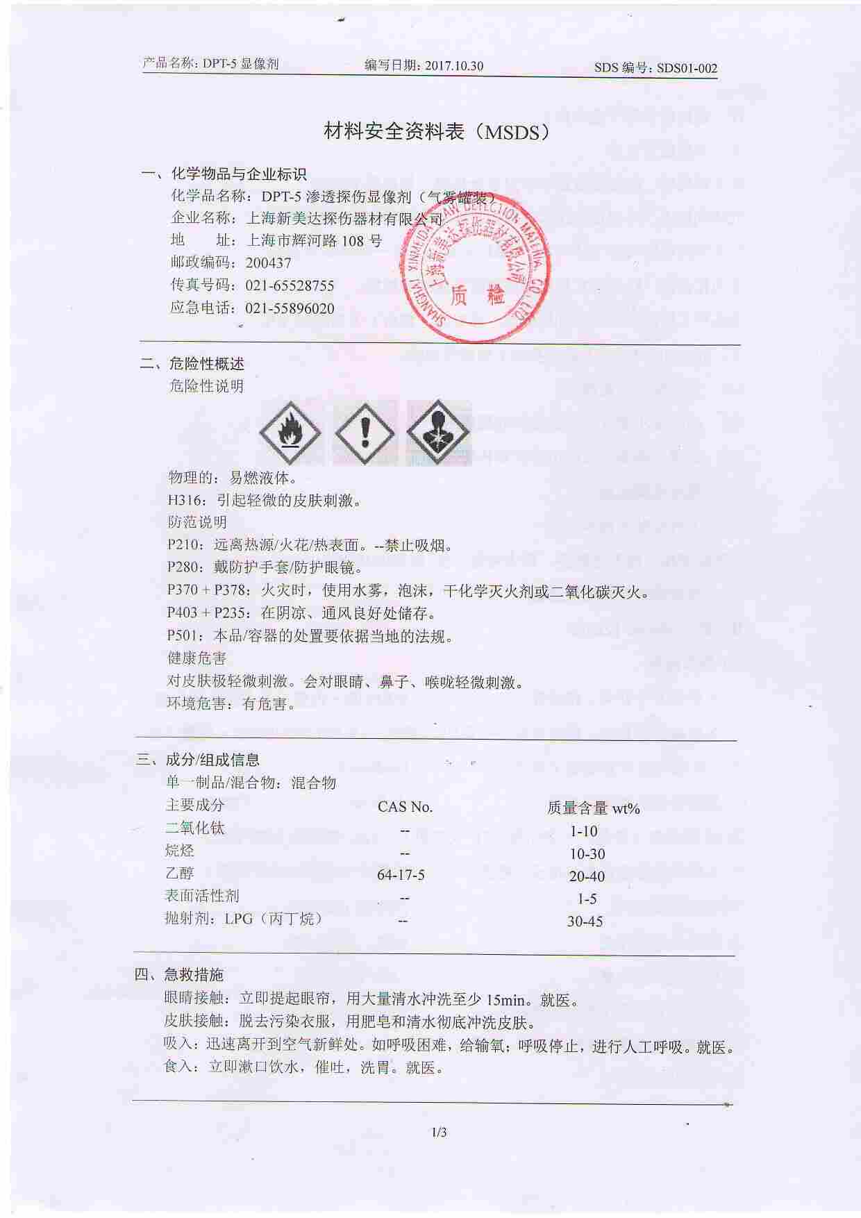 上海新美达DPT-5着色渗透探伤试剂安全材料表:(显像试剂)