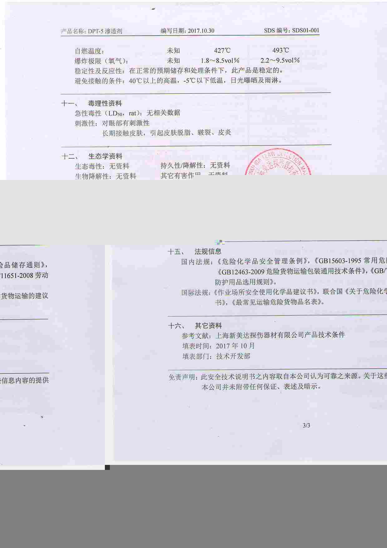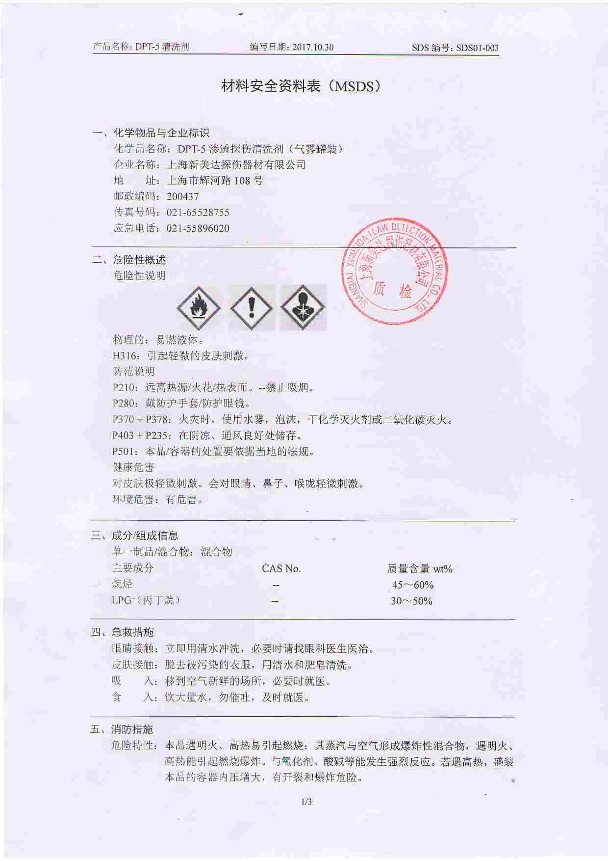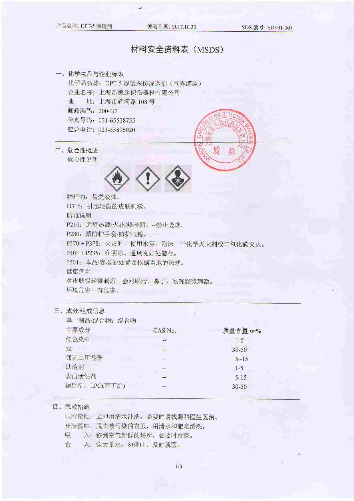 上海新美达DPT-5着色渗透探伤试剂安全材料表:(渗透试剂)