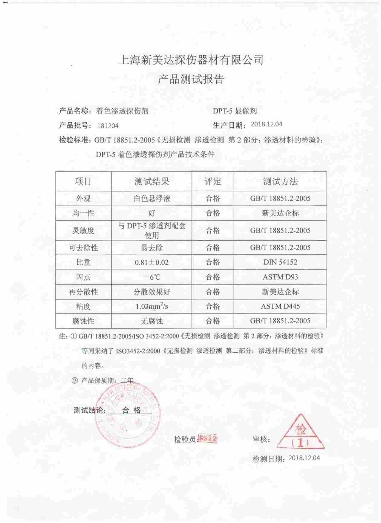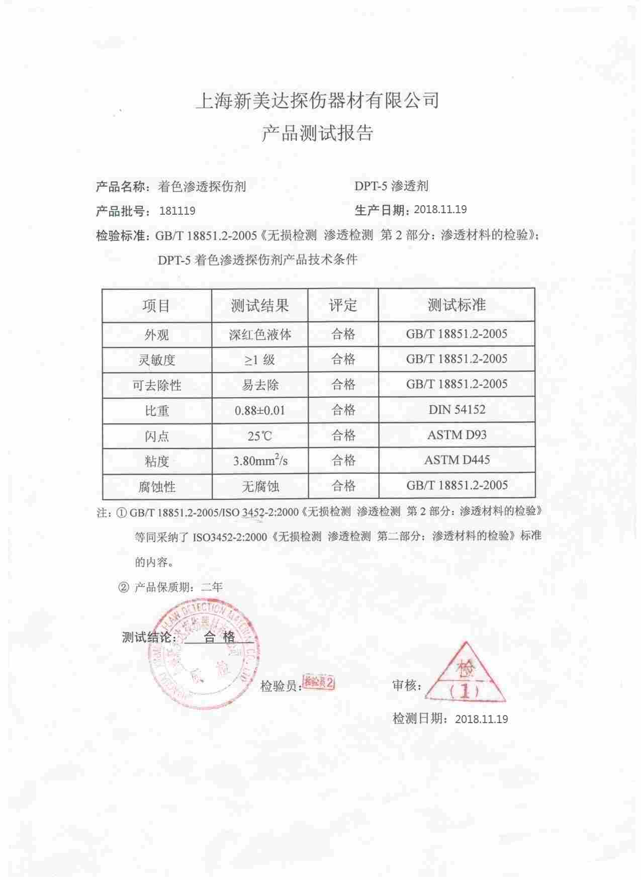 上海新美达DPT-5着色渗透探伤试剂质检报告: