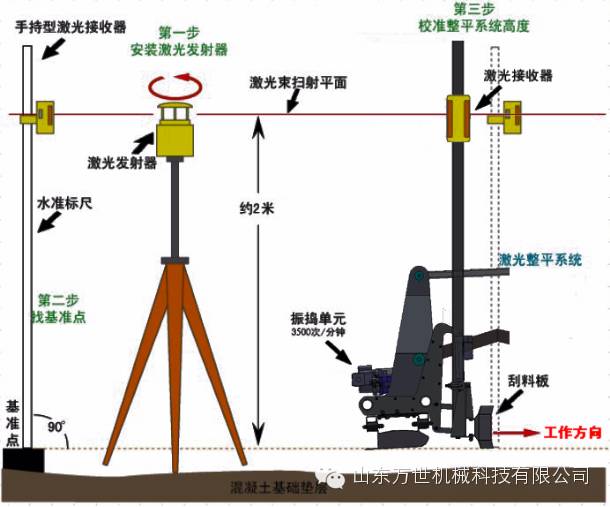 采用激光对点发射器,适用于大面积一次性铺筑。由激光测控系统实时控制标高,找平不需要拉控线,中间也不需要支侧模板来控制地面标高。从而避免了施工过程中因模板(槽钢)的震动而带来的标高误差,也减少了传统人工分块支模引起的标高误差。