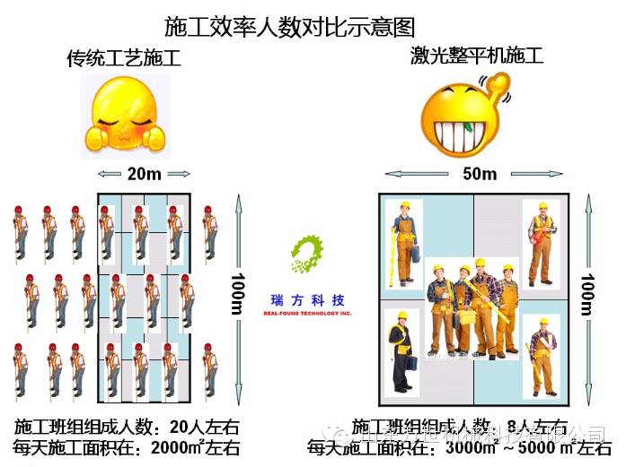 采用万世地坪激光整平机能将其体人数缩减为4—8人。可单人操作。每天施工面积提高至3000㎡—5000㎡。大大降低了人力成本。