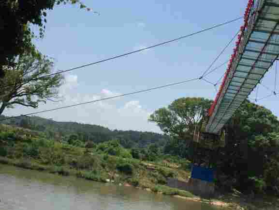 桥梁位于江西省吉安市,遵义玻璃吊桥检测鉴定中心,桥梁主缆为6根直径26.25mm的钢索,横梁采用截面尺寸为40mm×60mm方钢管组成的钢框架,框架间以3条直径为26.80mm的加劲索连接,吊杆采用直径为15.98mm的钢索,间距约为1.3m,桥面板采用厚30mm的安全玻璃,委托方未能提供蓝图。需对连接螺栓进行预拉力检测,蜘蛛人吊索在屋面固定需根据屋面固定点再行具体设定,