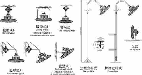 安装方式:A:吸顶式 b:管吊式 c:吸壁式 d:法栏立杆式 e:护栏立杆式