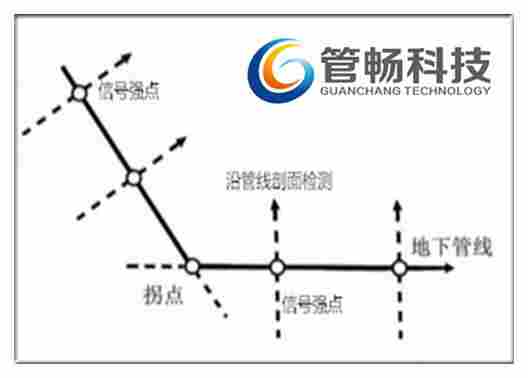 在无法确定管线的大致走向时,我们应该以接入点为圆心,以3-5米为半径,沿着圆周线盲探,找出信号强度值*的点标记为管线*个位置点,将接入点与*个点连接起来,就可以判断出管线大致走向;在沿着管线探测时,如果走向出现轻微弯曲,在弯曲线附近应当减小探测间距细致探测。