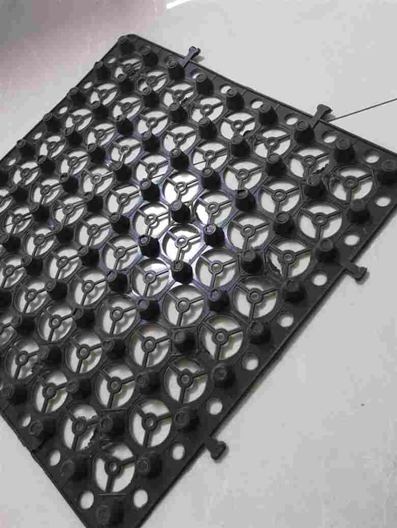 蓄排水板支撑面比较大,既不会因上覆无纺布下陷(如下图)阻塞排水通道,也不会因无纺布拉力不足撕裂导致泥土进入而阻塞排水通道,蓄排水板可以完整的保留排水空间,完全避免了塑料凸片因无纺布下陷导致排水不畅的情况发生,绝不会因排水不畅导致植被枯萎、死亡。