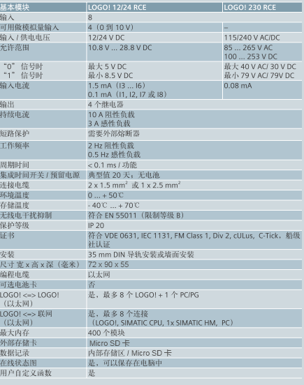 LOGO! 基本型和 LOGO! 经济型 (0BA6) 不同的电压,即12 V DC、24 V AC / DC、115 / 240 V AC / DC - 可以用于各种应用。 针对组态好的夏令时模式自动切换 - 降低了维护工作量 密码保护- 保护用户的工程知识产权 38个集成,预行过测试的功能- 除诸如运行时间计数器外,无需额外设备 可实现200个功能链接-在没有任何限制下即可可以实现广泛的应用 板载八个数字输入(包括4个AIs以12 / 24伏直流电)和四个数字输出 消息文本,行动项目和电流值,以及可以在显示屏上实现显示值的直接修改(除Pure版本外) 非易失性数据存储器- 在一个电源发生故障时防止电流值损失 具有灵活的扩展性,大可达到24个DI数字输入,16个DO数字输出,8个AI模拟输入和2个AO模拟输出-保护原有投资-适合广泛的系统应用 LOGO! 软件Soft Comfort V6 用于在 PC 上用户友好性的生成控制程序,适用于多种操作系统,如 Windows 95/98、NT 4.0、Me、2000、XP、Vista、MAC OS X 10.4 with J2SE 1.5.0 和 SUSE LINUX 10.0 在所有的0BA6基本设备上实现远程文本显示的连接能力 LOGO! 基本型(0BA7) 该0BA7基本设备的亮点毫无疑问地在于标准以太网接口作为编程接口,以及与其他标志交流! 0BA7基本设备或如SIMATIC S7的处理器,人机界面面板,和PC SIMATIC自动化元件。 标准的以太网接口编程接口,并与其他标志的沟通!基本设备0BA7或SIMATIC自动化元件,如SIMATIC S7的处理器,人机界面面板和PC 多的8个LOGO!s可实现联网功能 数据记录 标准SD卡作为存储介质 与LOGO! 0BA6兼容的程序和连接设计和功能
