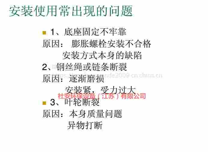 低速推进器起吊系统底座、钢绳固定架和导向底座与池的有关联接 面均采用膨胀螺栓固定,无需预留孔。低速推进器安装系统Ⅱ用导向 钢绳替代导杆,具有运输方便、现场安装简单等特点。低速推进器从根本上避免了由于运输引起导杆弯曲、变形有而影响正常使用的情况, 并有效改善了池深过深情况下,由于导杆的安装误差而导致的无法正常起吊 等现象。