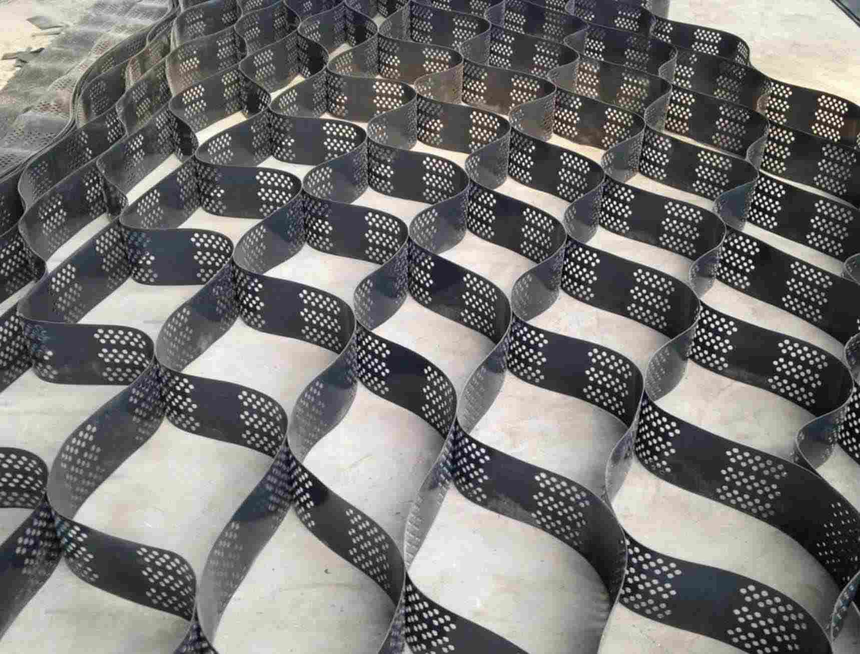 土工格室是由强化的HDPE片材料,经高 强 力 焊接而形成的一种三维网状格室结构。一般经超声波针式焊接而成。因工程需要,有的在膜片上进行打孔。