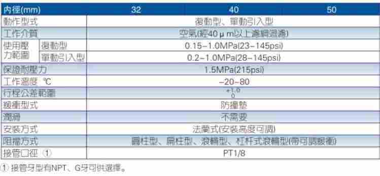 TWG系列阻挡气缸:JIS标准,加粗活塞杆,带自锁机构;可调高度与固定高度可选;多阻挡方式可选,油压缓冲器可选;缸径:32、40、50;接管口径:1/8".
