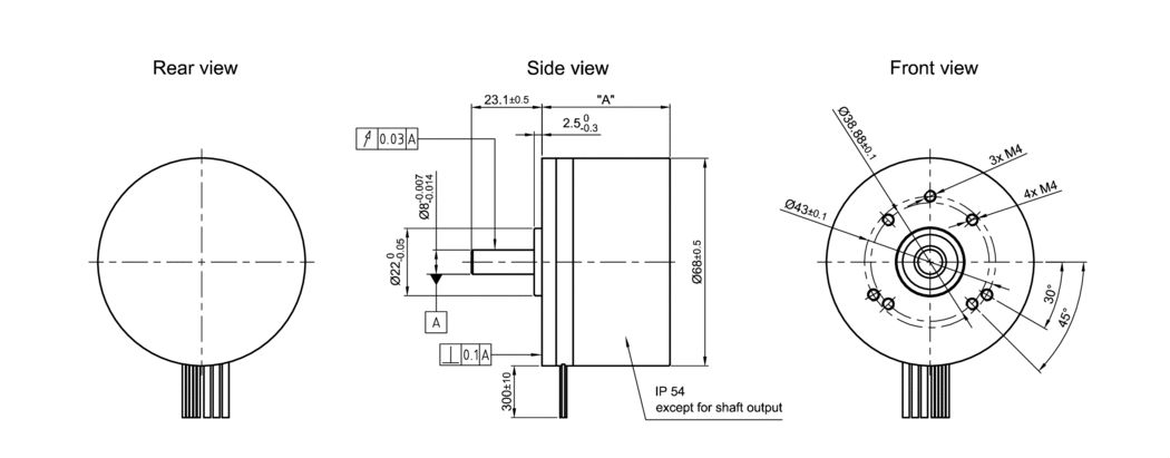 DFA68,外径68 mm,额定功率110 W. 外壳带IP54防护等级可有效防止飞溅水和异物的渗透引起的电机损坏. DFA68额定电压24 V,额定速度3,700 r/min, 额定力矩29 Ncm. 它的14极结构确保它能够在低速下非常安静的运行。