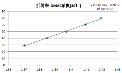 1. 配置标准浓度梯度的DMAC溶液:使用分析天平分别准确称取DMAC分析纯试剂置于具塞试管,并分别加入纯水,配置成30%,40%,50%,60%,70%的DMAC溶液备用。根据实际称量结果,修正浓度。