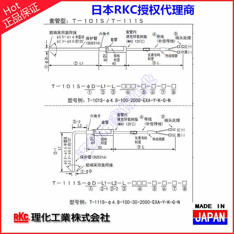 T-30S/T-35S接线盒型铠装热电偶温度探头 日本RKC理化工业,两种接线盒尺寸供选,T-30S-4.8-100-K-G-N,T-30S-4.8-100-2000-EXA-Y-K-G-N,T-35S-4.8-100-K-G-N,T-35S-4.8-100-2000-EXA-Y-K-G-N(附导线).