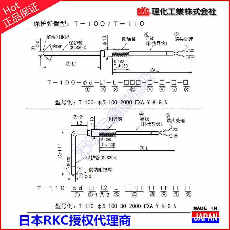 T-100/T-110系列热电偶,日本RKC温度探头,T-100-5-100-2000-EXA-Y-K-G-N带引线热电偶,T-110-5-100-30-2000-EXA-Y-K-G-N弯角热电偶.