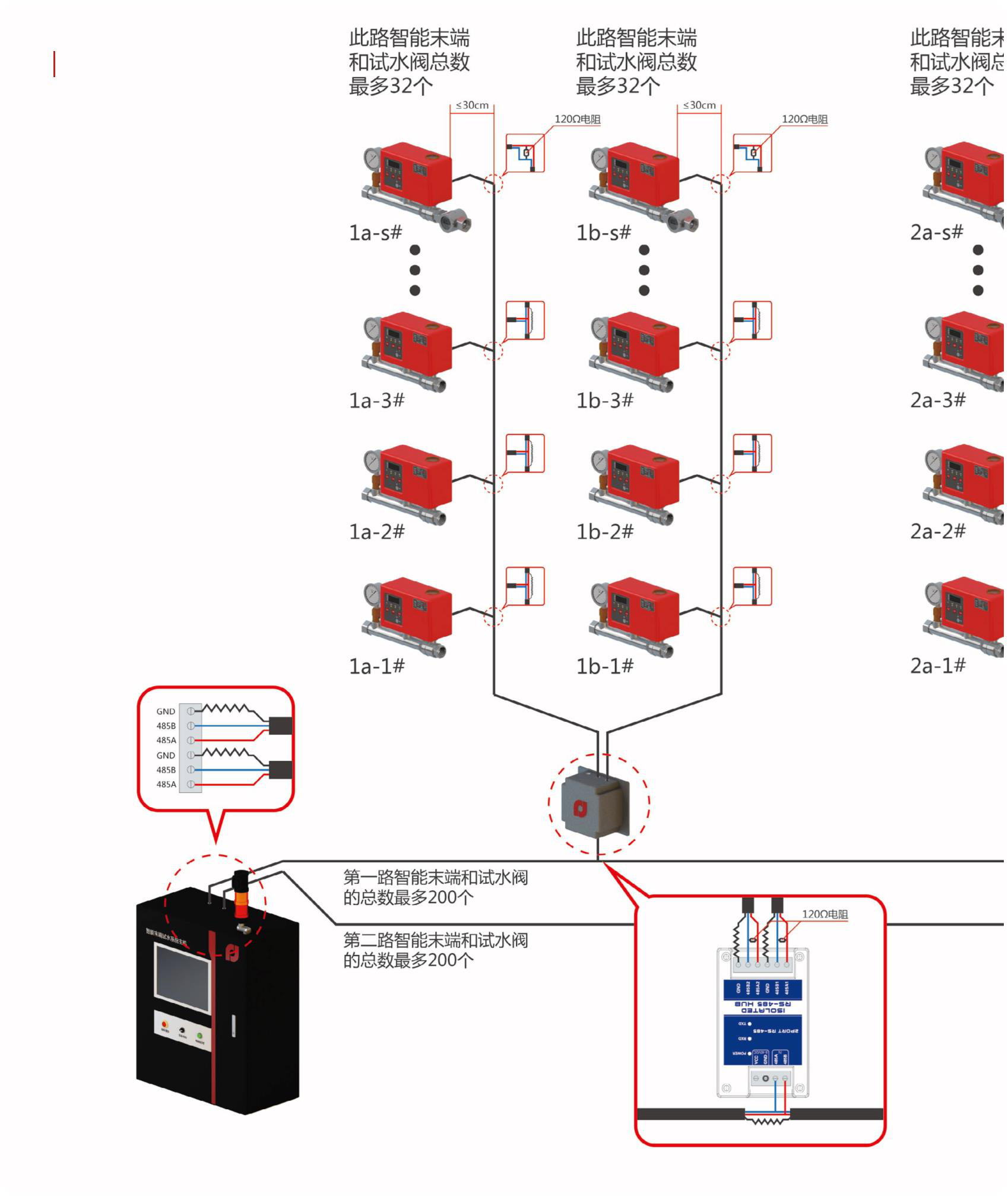 智能末端试水系统采用在工业领域内广泛应用的 RS-485 二总线通讯技术,其中通讯电缆和供电电缆的材料采购、施工由施