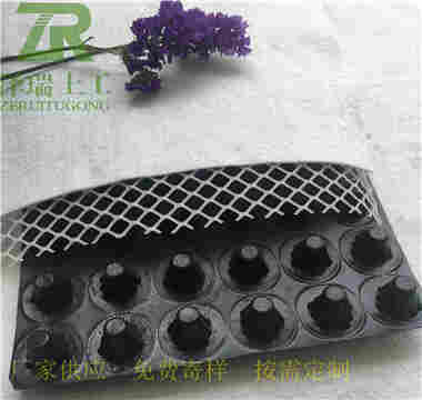 蓄排水板材料特点:蓄排水板采用高密度聚乙烯(HDPE)或聚丙烯经加热加压定型形成的一种既能营造具有一定立体空间支撑刚度的排水通道,又可蓄水的一种轻型板材。