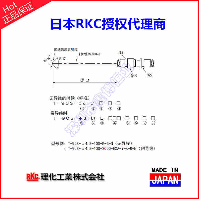 T-101N/T-111N高温铠装热电偶测温探头 日本RKC理化工业,T-101N-4.8-100-2000-EXA-Y-K-G-N,T-111N-4.8-100-30-2000-EXA-Y-K-G-N弯角90度