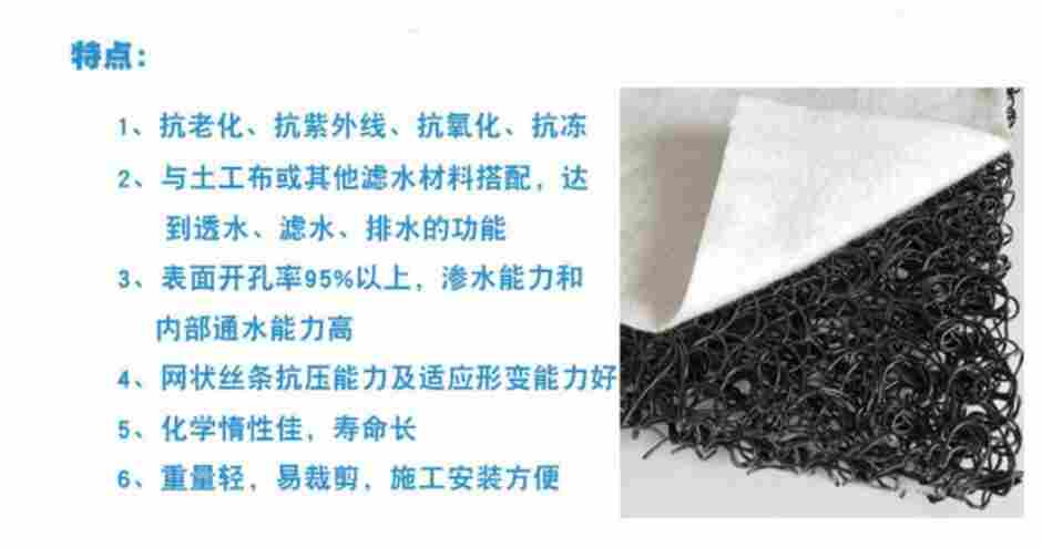 产品应用: 绿化工程:车库顶板绿化、屋顶花园、足球场、高尔夫球场、浴场工程。 市政工程:道路路基、地铁隧道、垃圾填埋场。 建筑工程:建筑物基层或下层、地下室外墙体、层面防渗和隔热层等。 交通工程:公路、铁路路基、堤坝和护坡层。