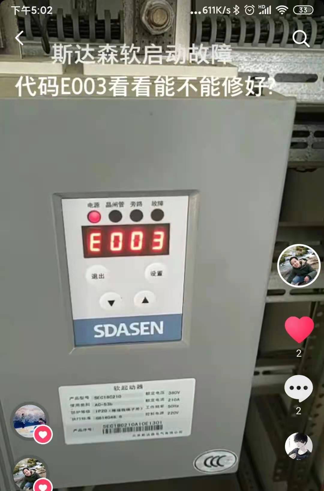 斯达森软启动是北京的厂家研发并生产的,东北华北内蒙青海等地使用量比较多。遇到的故障大多都是缺相和不显示启动不了,遇到几个斯达森软启动故障,山东潍坊一台SEC18C075A软启动,显示屏不亮启动不了,另外一台是北京和辽宁本溪的客户110KW和250KW,两个都是报E003故障。就主要说一下斯达森E003故障代码。