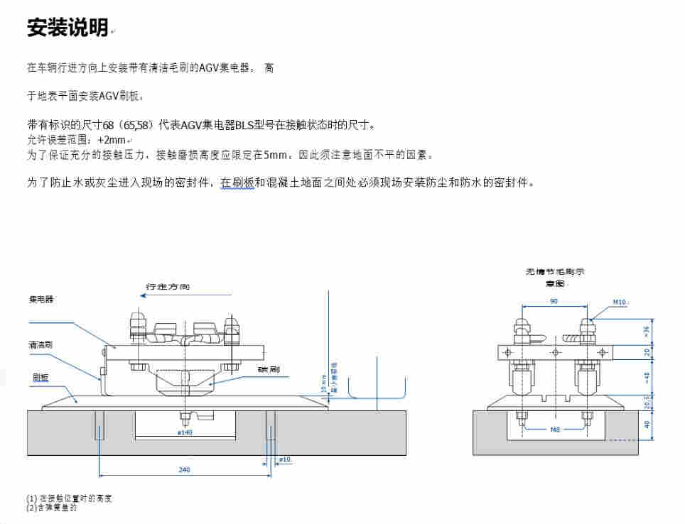 电池充电装置由刷板和刷块组成,刷板安装在地面上,或者可以用支架侧装在AGV运行轨道的旁边,刷块则安装在车辆上。工厂电源给刷板提供动力,一旦AGV行驶到充电位,并且刷块和刷板接触,就会对AGV进行充电。刷板上的滑入/滑出斜面能够帮助刷块平稳的驶入或驶出,安装在刷块上的毛刷可以扫除刷板上的残留物腾为电池充电装置工作电压为12-80V,当额定电压大于25VAC 或者60VDC时必须加装保护装置以避免意外触碰。