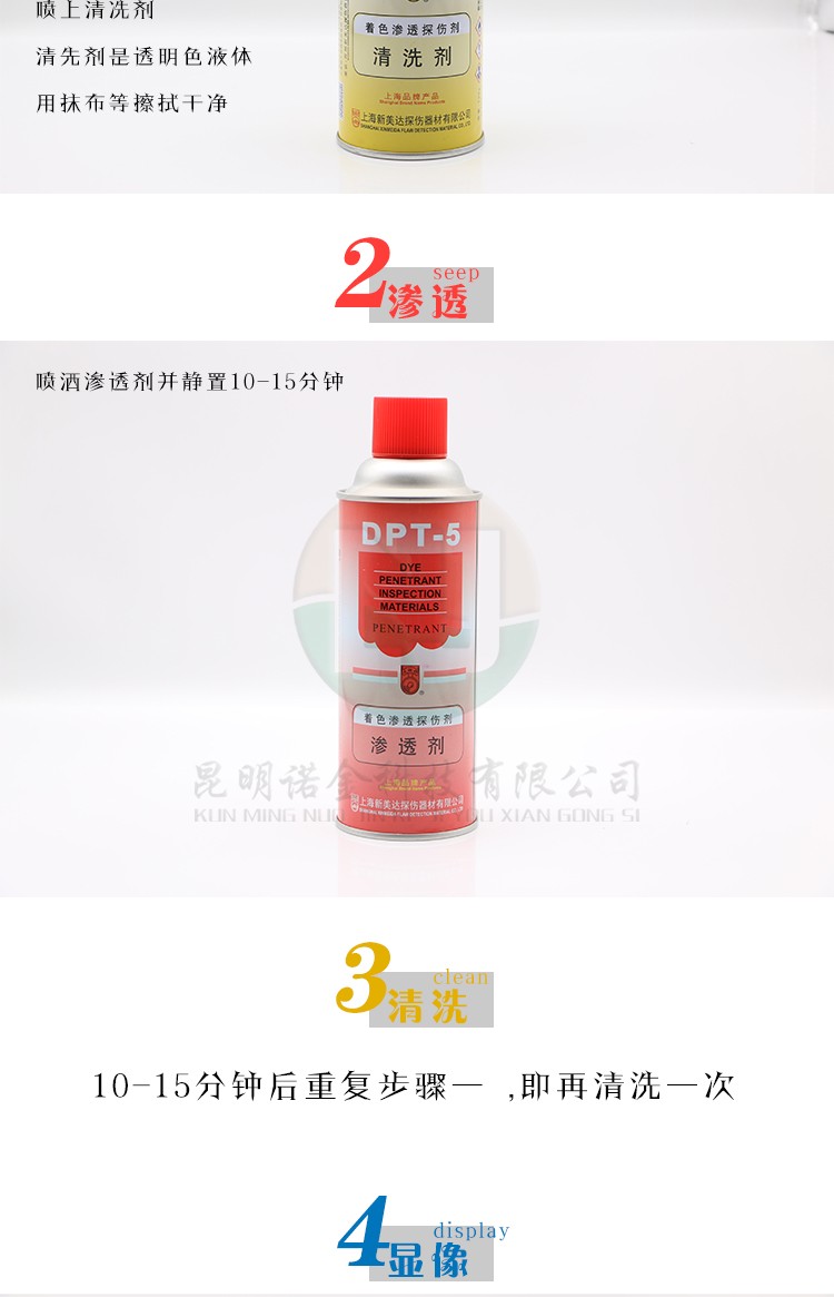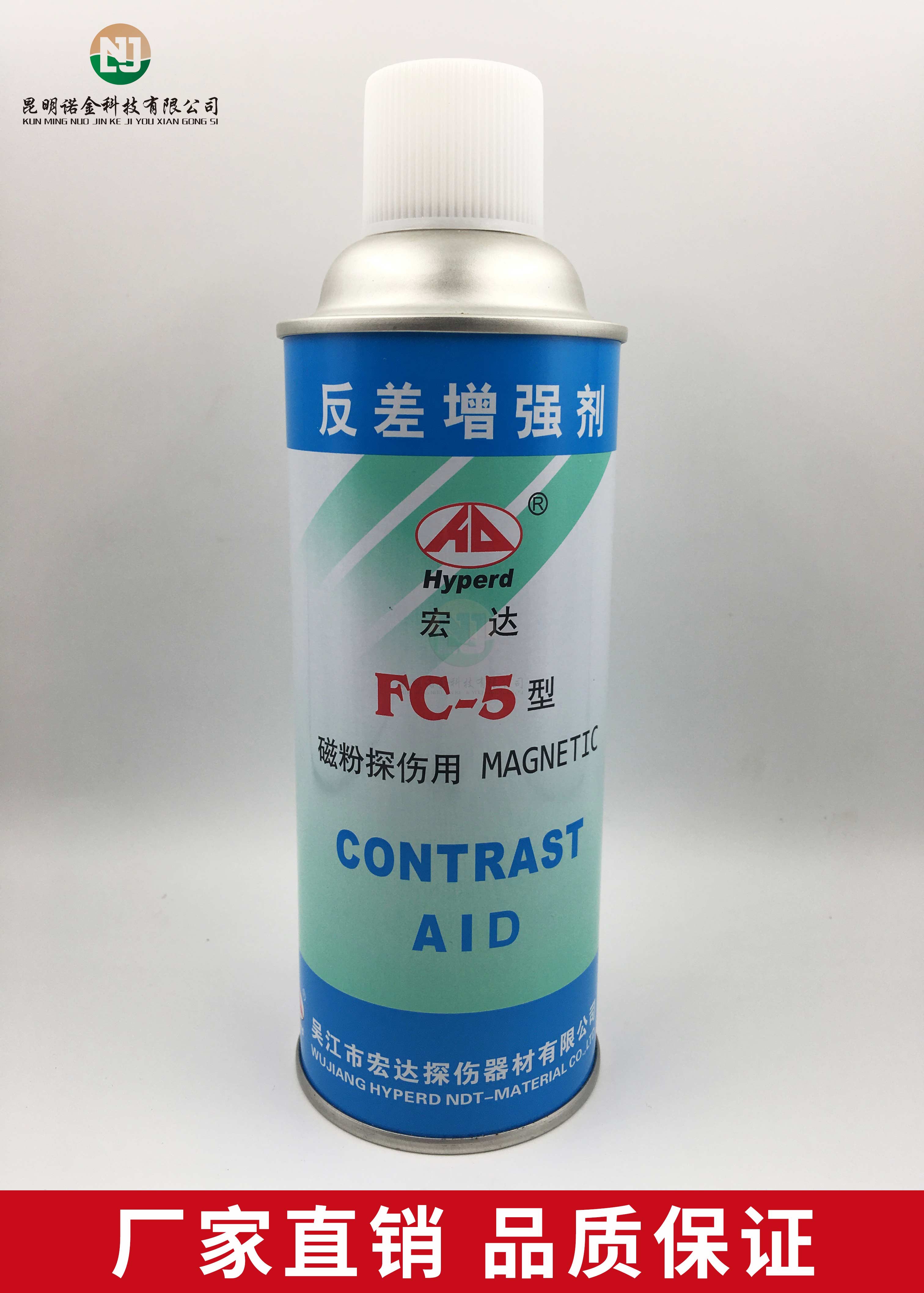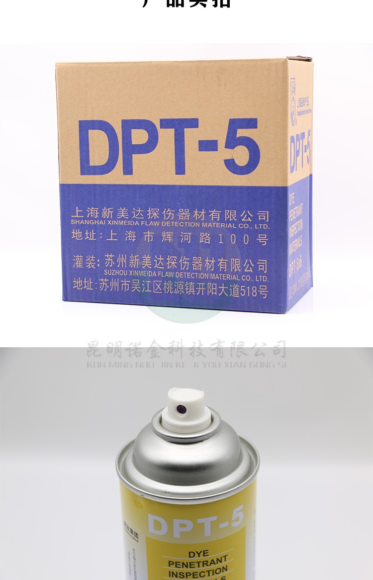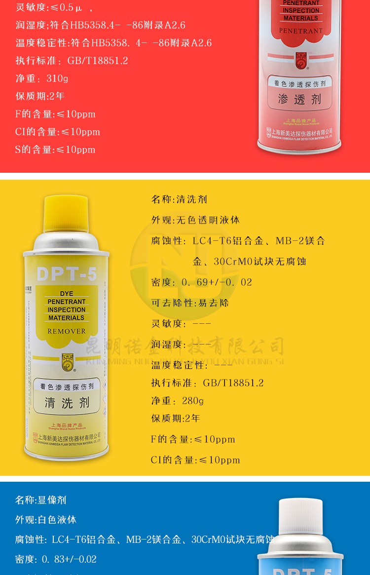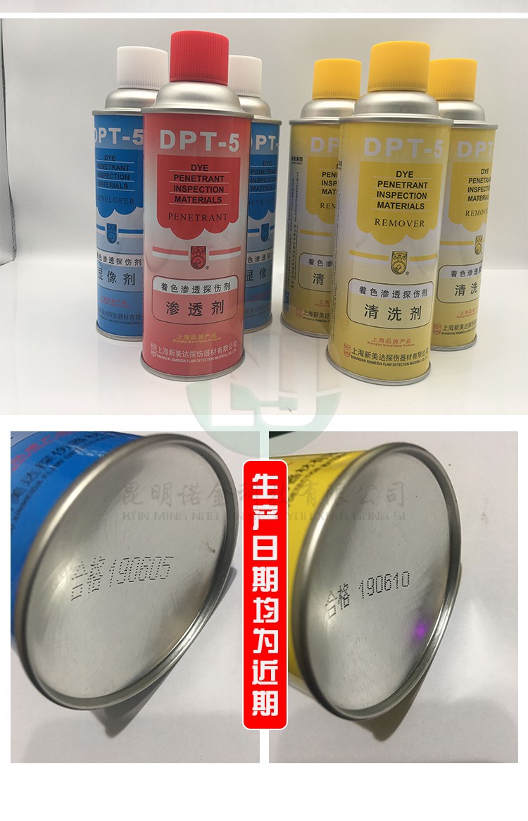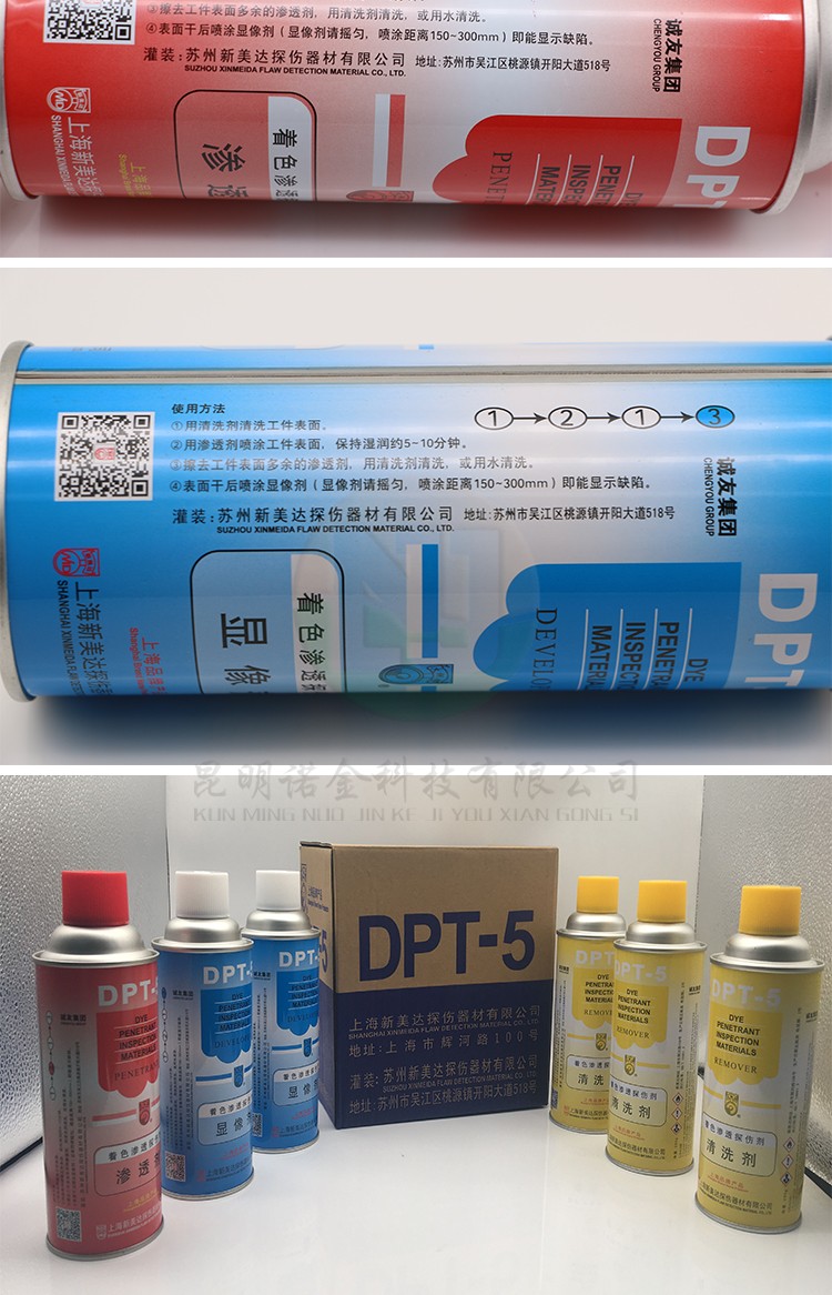 昆明诺金科技有限公司大量现货供应上海新美达DPT-5着色渗透探伤试剂;吴江宏达H-ST着色渗透探伤剂、HD-BO黑油/黑水磁悬液、FC-5反差增强剂、黑/红磁粉、超声波耦合剂、探伤试块探头、爱克发胶片、宏达工业胶片、磁粉探伤仪、超声波探伤仪等探伤仪器及耗材,量大优惠,欢迎咨询下单!网络销售店铺:昆明诺金科技888,实体店销售地址:云南省昆明市官渡区云秀路官南城14栋2-103,各地均可发货,省外客户可以发京东快递,云南省内客户可以发中通快递。