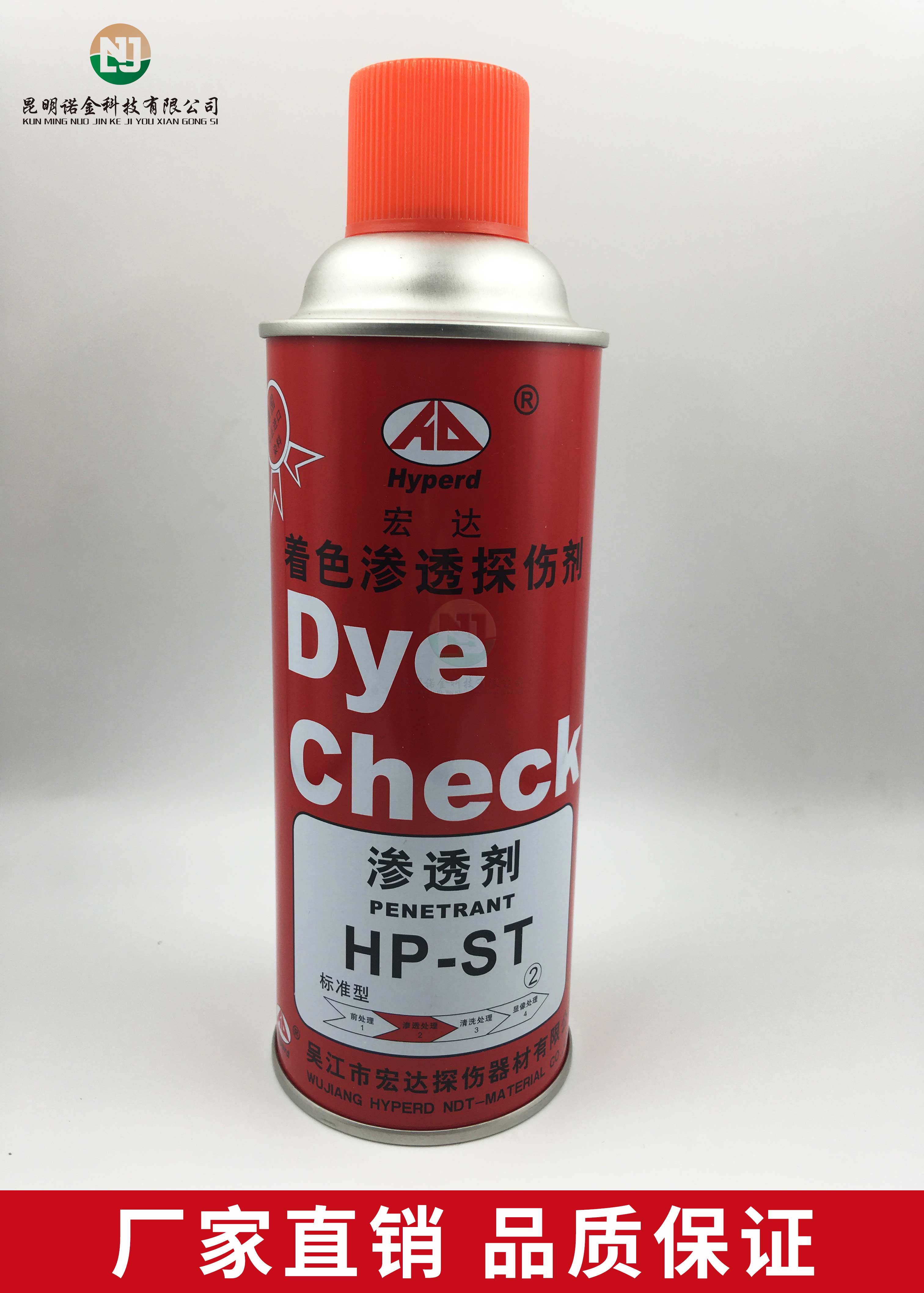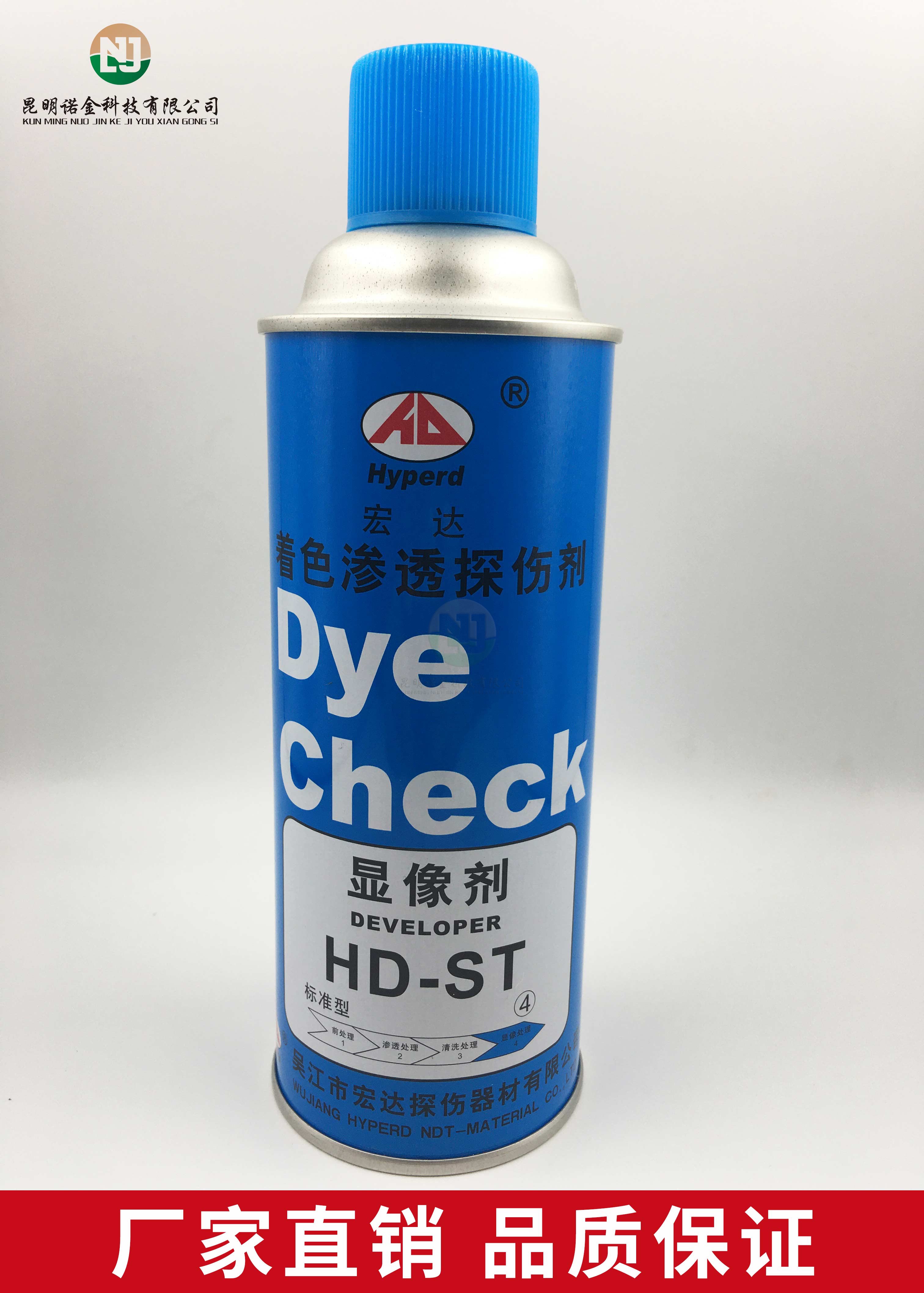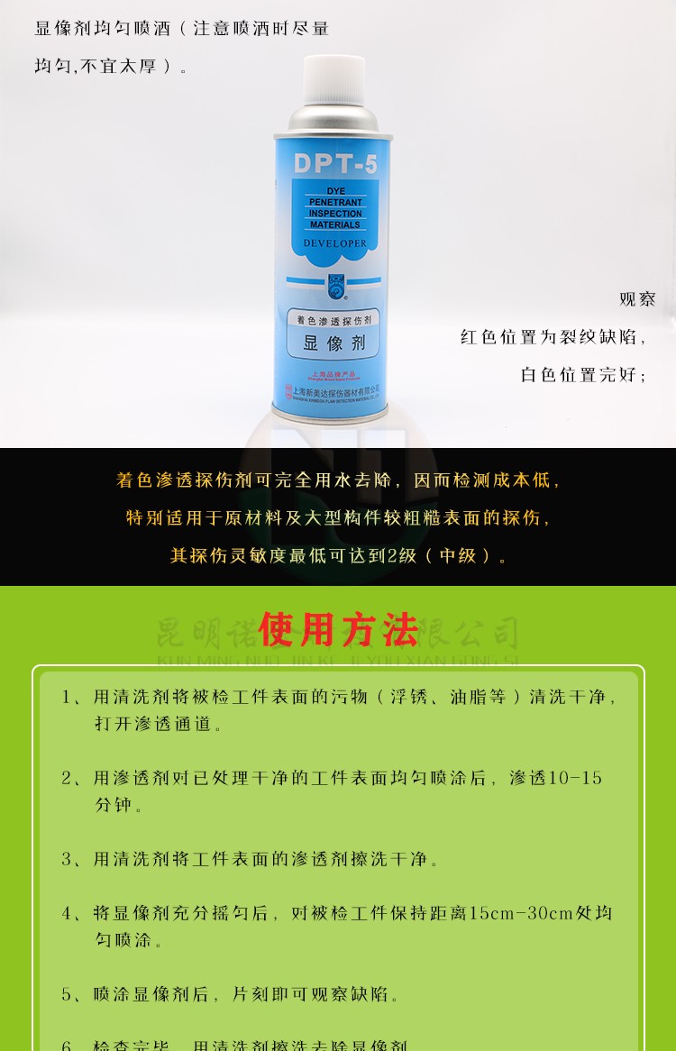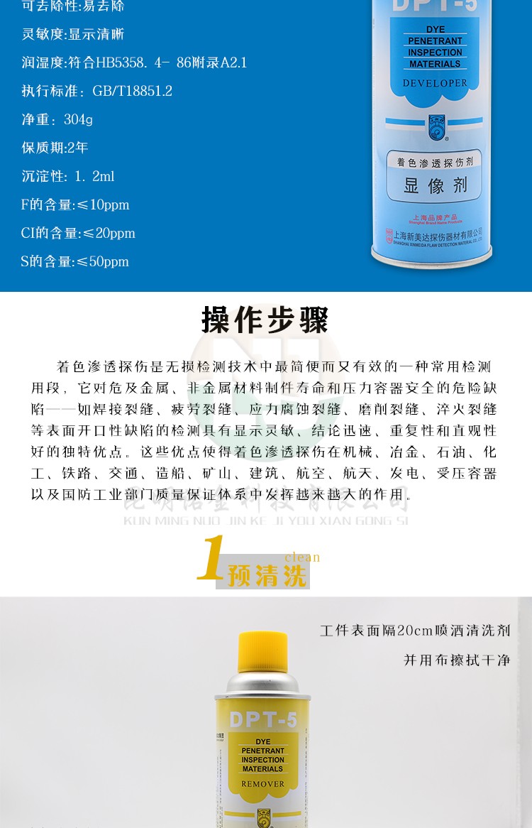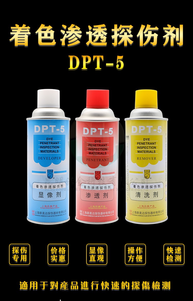 昆明诺金科技有限公司大量现货供应上海新美达DPT-5着色渗透探伤试剂;吴江宏达H-ST着色渗透探伤剂、HD-BO黑油/黑水磁悬液、FC-5反差增强剂、黑/红磁粉、超声波耦合剂、探伤试块探头、爱克发胶片、宏达工业胶片、磁粉探伤仪、超声波探伤仪等探伤仪器及耗材,量大优惠,欢迎咨询下单!网络销售店铺:昆明诺金科技888,实体店销售地址:云南省昆明市官渡区云秀路官南城14栋2-103,各地均可发货,省外客户可以发京东快递,云南省内客户可以发中通快递。