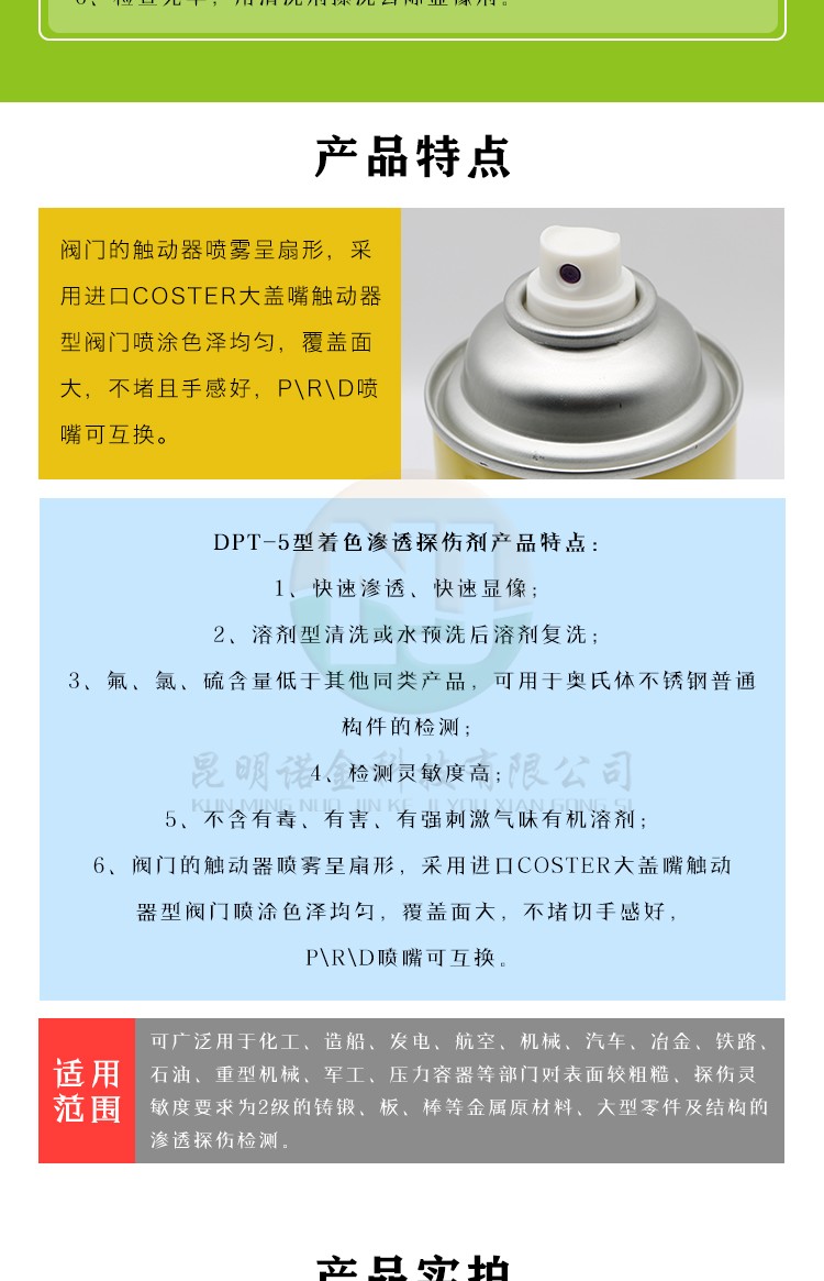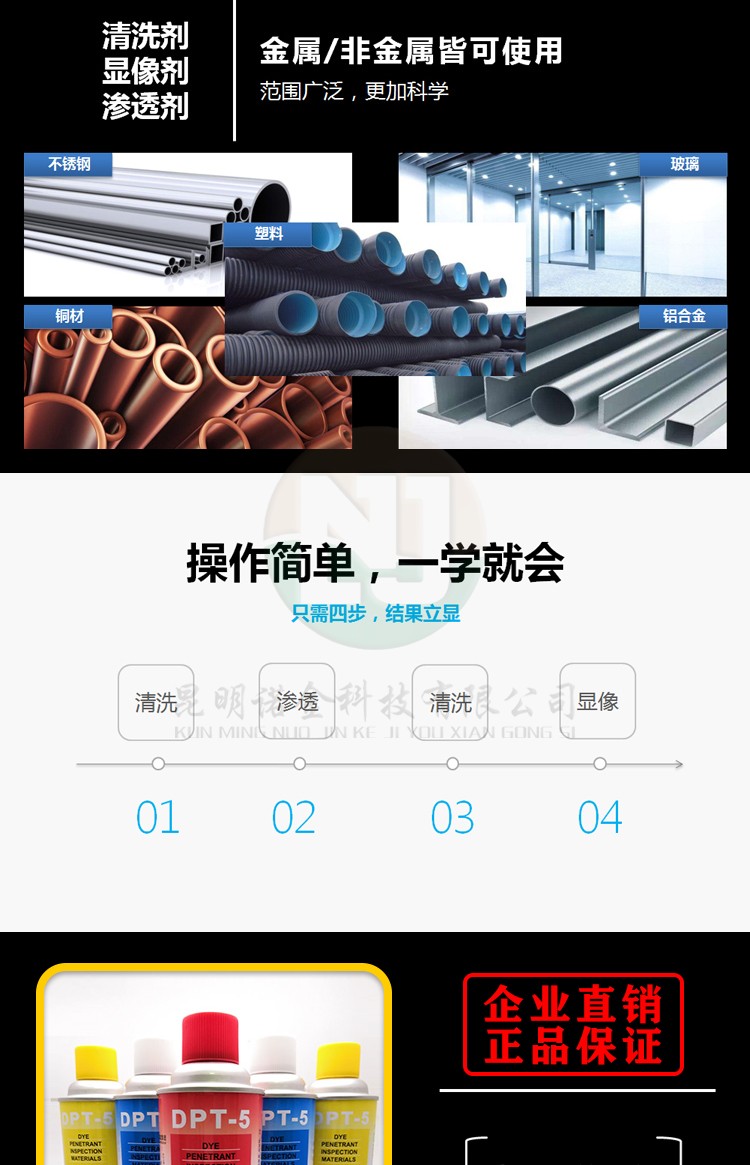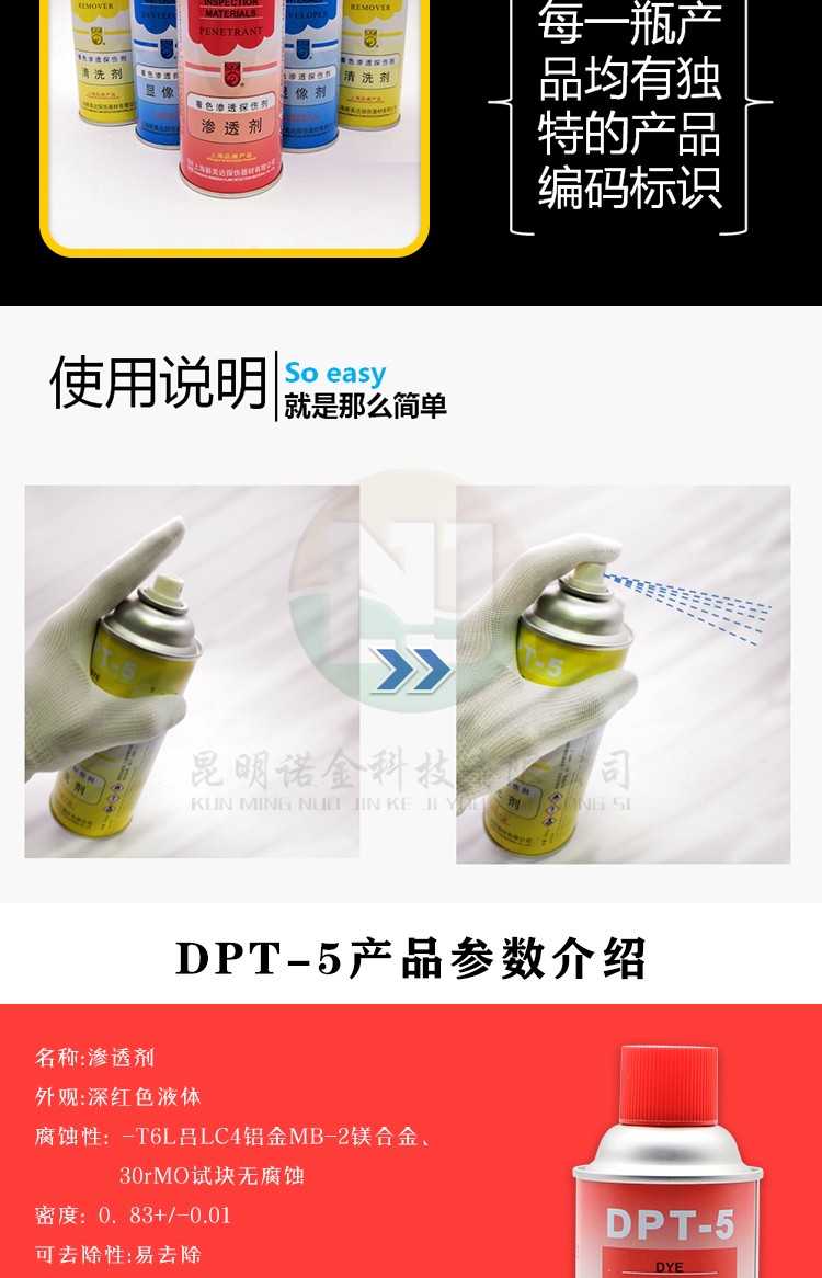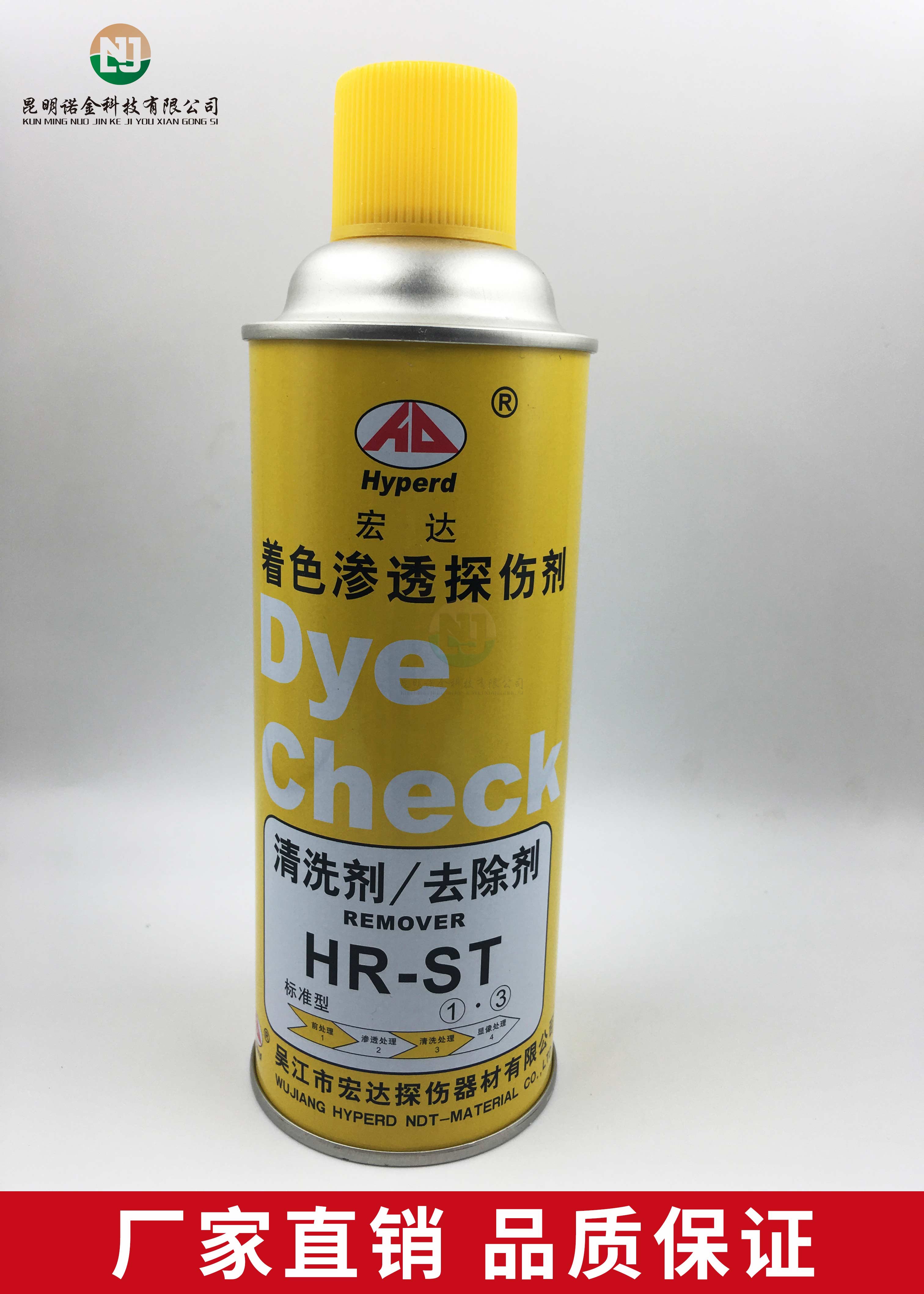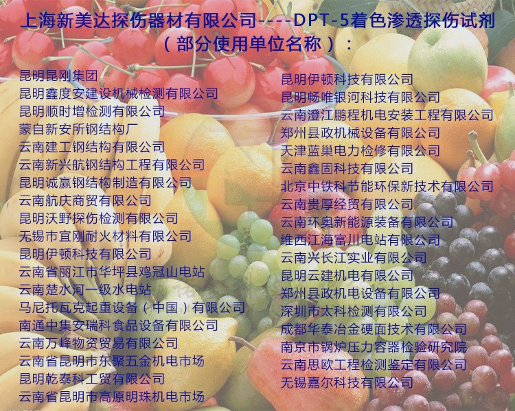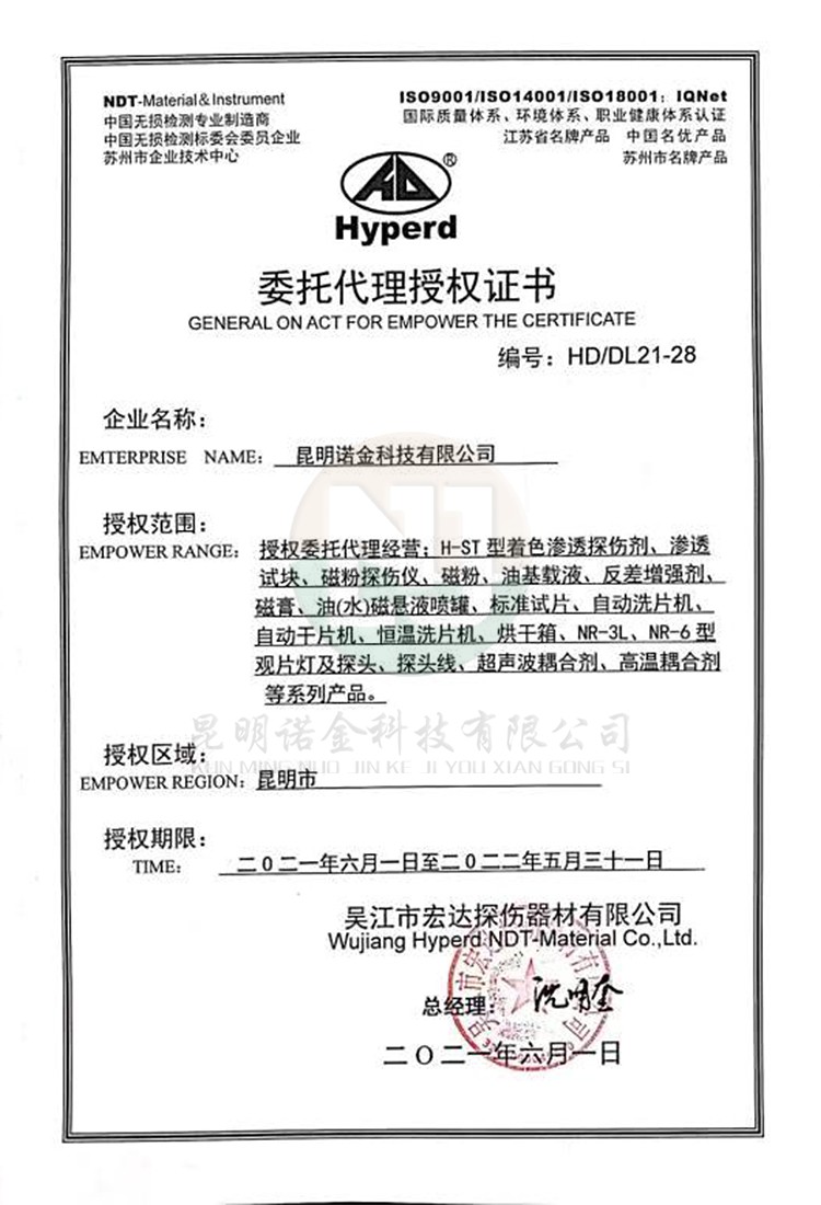 昆明诺金科技有限公司大量现货供应上海新美达DPT-5着色渗透探伤试剂;吴江宏达H-ST着色渗透探伤剂、HD-BO黑油/黑水磁悬液、FC-5反差增强剂、黑/红磁粉、超声波耦合剂、探伤试块探头、爱克发胶片、宏达工业胶片、磁粉探伤仪、超声波探伤仪等探伤仪器及耗材,量大优惠,欢迎咨询下单!网络销售店铺:昆明诺金科技888,实体店销售地址:云南省昆明市官渡区云秀路官南城14栋2-103,各地均可发货,省外客户可以发京东快递,云南省内客户可以发中通快递。