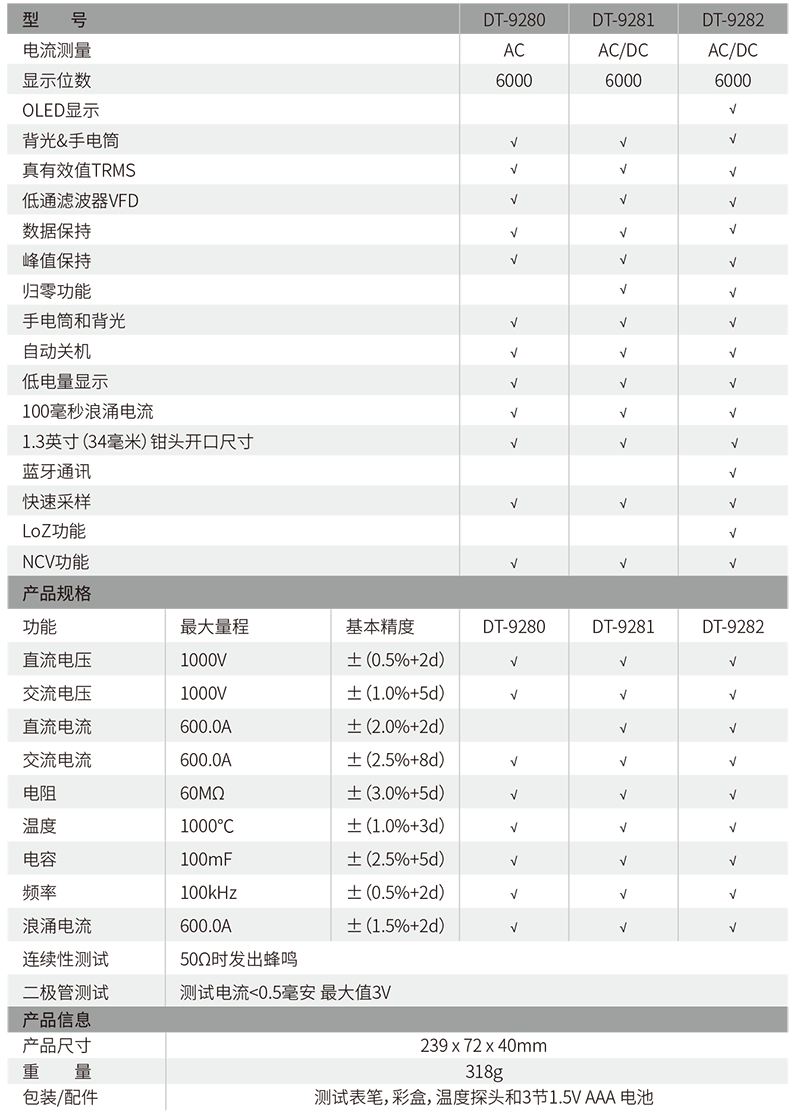 真有效值TRMS高清LCD背光显示快速A/D转换采样1.3”(34mm)钳口开口低通滤波器用于准确测量变频驱动(VFD)信号双注塑机壳2米防摔LoZ功能,低阻抗输入避免杂散电压引起的读数错误NCV功能CAT III 1000V CAT IV 600V安全等级浪涌电流可滤掉杂波,准确捕捉到电机启动电流