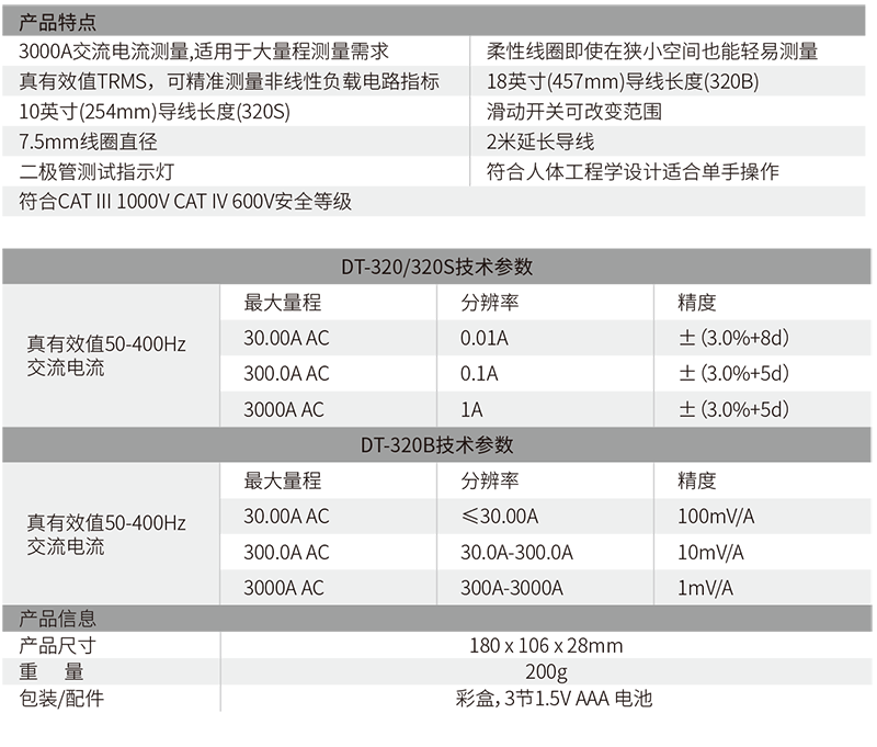 CEM DT-320系列是具备普通钳形表所有功能的3000A交流真有效值柔性线圈钳形表,可以将电流量程扩展到3000A ,设计新颖,使用便捷,能测量尺寸不规则和拥挤的排线,柔性电流钳可测量400Hz的频率,两米长的延长柔性钳,可扩大测量间距;背光显示,即使在较暗的和狭小的空间也能轻松完成测量。