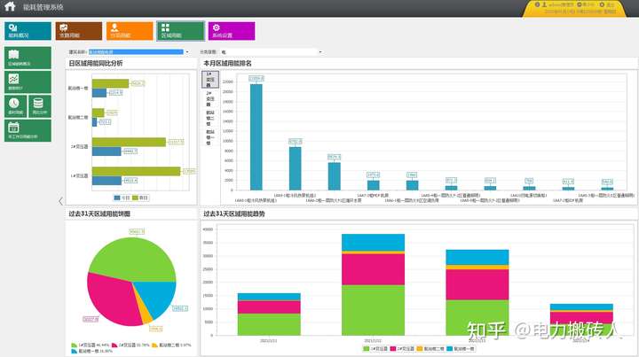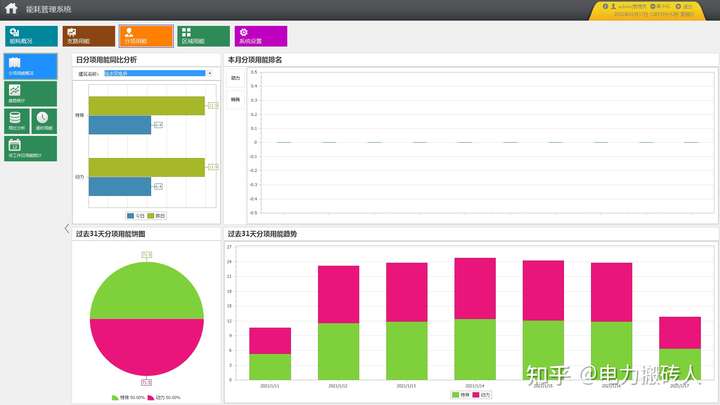 系统可以按照分项进行能耗统计与显示。其中,日分项用能同比分析图显示不同分项的当日与昨日能耗柱状图(蓝色柱表示,绿色柱表示昨日);用能饼图显示各分项过去31天的用能占比;堆积图显示各分项过去31天的能耗趋势;分项用能排名图显示被选中分项对应能耗值排名前10位的支路。