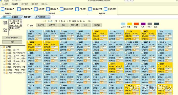 系统的批量操作功能,针对开户状态、报警1、报警2、欠费、失联等状况分别用不同的颜色显示;远程对仪表进行遥控的命令类型包括:电价下发、设置下发(下发报警金额阈值和过载功率阈值)、保电(强制仪表合闸)、恢复预付费(欠费自动跳闸的模式)、拉闸(强制断电)和抄表导出(导出当前所有表状态为EXCEL文件),如下图所示: