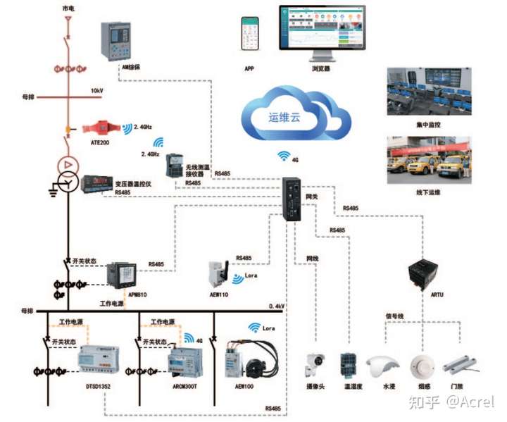 系统采用AcrelCloud-1000变电所运维云平台,变电所现场设置数据采集箱,通过外网将数据传输到运维平台服务器。