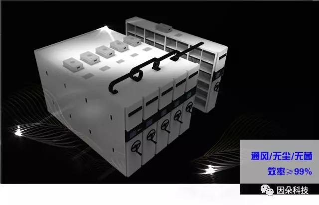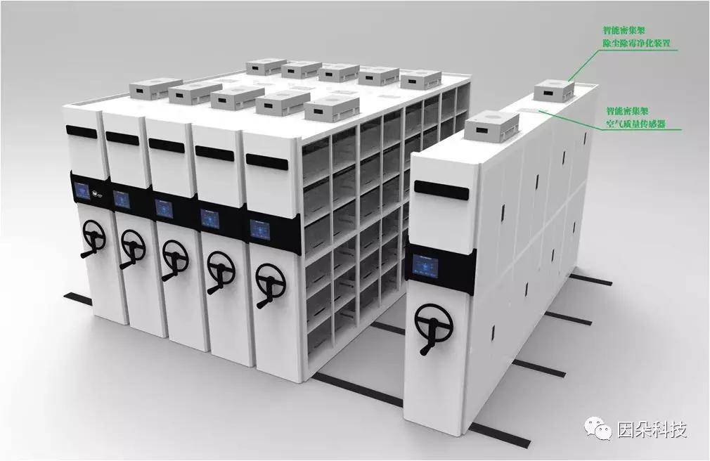 目前市场智能密集架功能基本都具有三重安全保护系统、自动定位功能、远程控制功能,自动唤醒、语音操作、节能低碳模式设定、自动闭架、红外记录等功能,但是对于架体内档案存储环境的通风问题,档案存储后要定时取出来频繁进行消毒处理问题一直困扰着相关工作人员,因朵科技针对此类多项问题,在智能密集架功能上进行了创新。