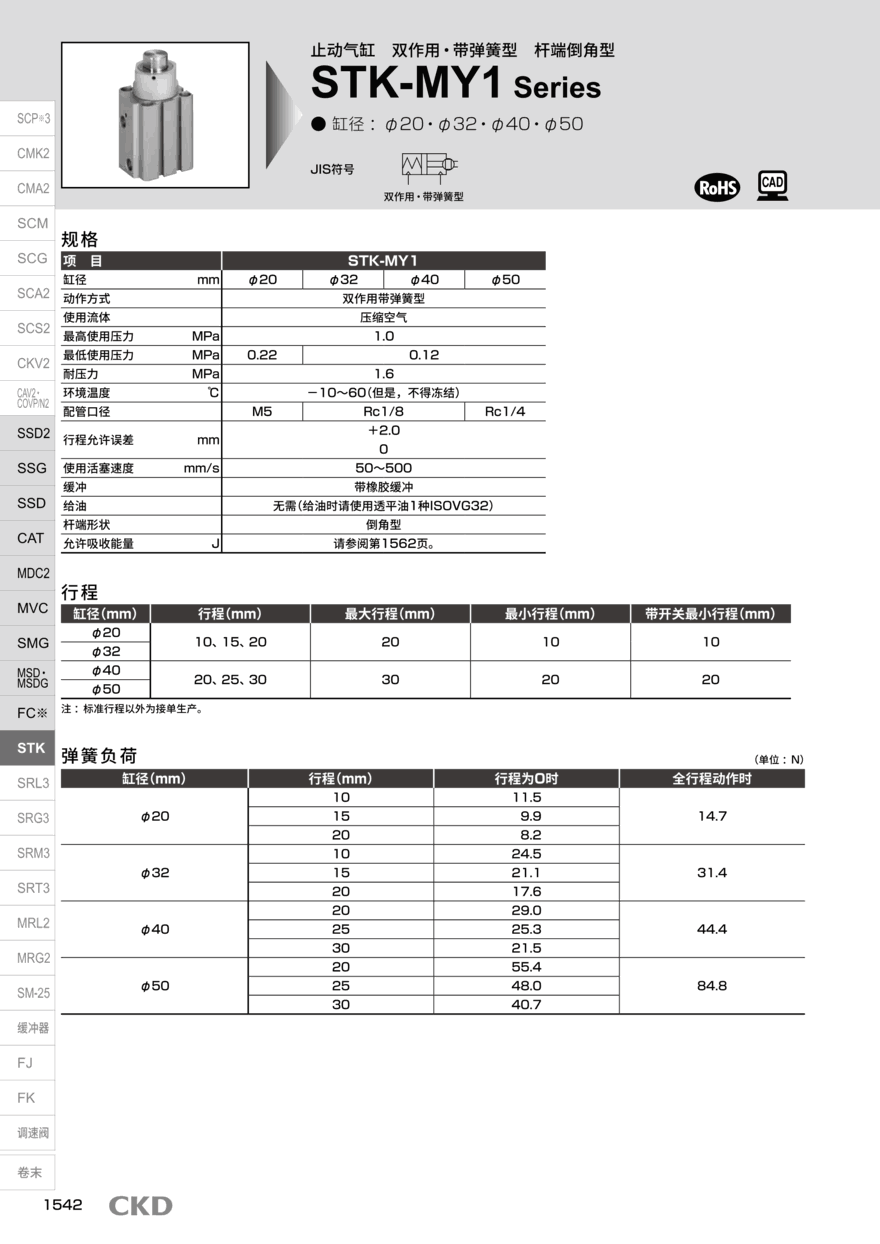 STK-MY 单作用?加压缩回型?杆端倒角型 Φ20, Φ32, Φ40, Φ50 10, 15, 20, 25, 30