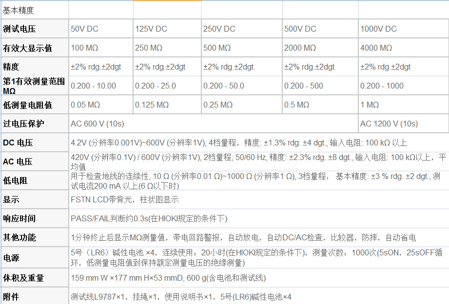 IR4057-20绝缘电阻表,带测试线L9787(1.2m),挂绳,携带盒C0100,5号碱性干电池*4。