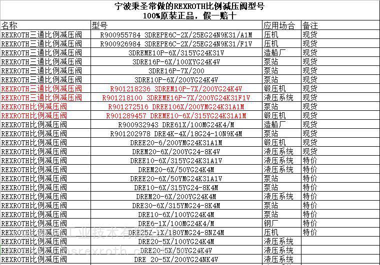 销售BOSCH - REXROTH(博世-力士乐)的液压备件、力士乐R900767522气动备件、力士乐工控备件等产品。公司凭借着力士乐产品种类齐全、价格低 、供货期快、售后服务有保证等优势,已与国内各大力士乐R900767522分销商、生产配套厂、力士乐R900767522液压系统使用客户,建立了长期供货及信任关系。同时为了缩短供货期保证客户的贴身利益,我们还专门建立了BOSCH - REXROTH常用备件的库存,并派专人进行管理。