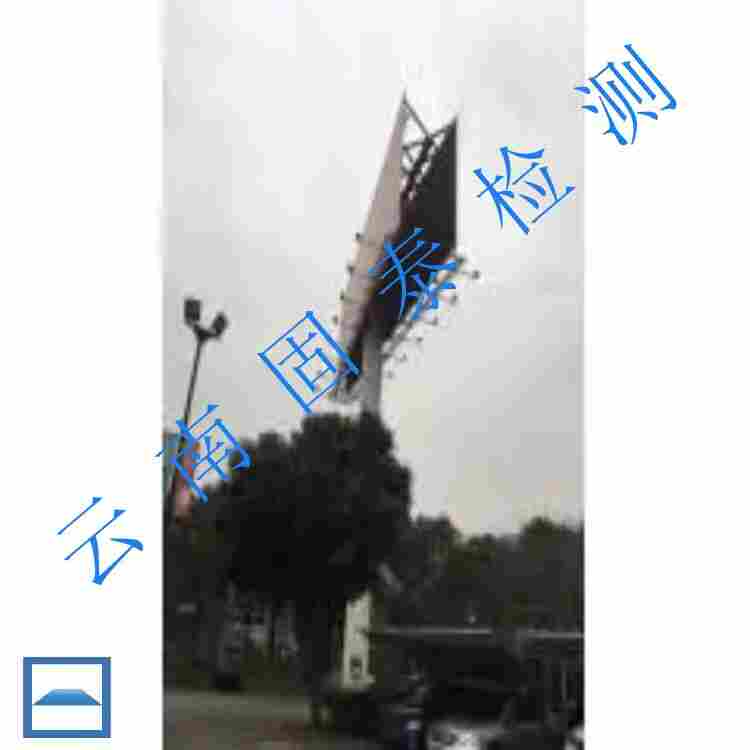 户外广告牌安全检测鉴定检测项目:根据通信塔广告牌的结构系统、工艺布置、结构现状、使用条件,评断承重结构系统,抗灾能力。适用范围:需要进行通信塔广告牌的检测,如电信移动塔、堆压式广告牌等。现场检测:承载物负载力检测、结构性能安全评估等。通信塔广告牌检测报告范围内有效。云南固泰检测技术服务有限公司除拥有鉴定、冲裁、检测、资质外,还拥有设计资质、加固专项资质、工程承包一级资质,可以提供从鉴定、设计到施工的服务。服务项目:1、铁塔基础检测,包含塔基沉降和基础倾斜检测;2、铁塔钢结构变形检测和高强度螺栓检测;3、铁塔结构可靠性计算分析;4、钢结构检测:挠度测量、水平、垂直位移和扭曲值测量、构件尺寸测量、焊缝无损检测、锈蚀检测、钢材力学性能的检测、螺栓连接质量现场检测;5、铁塔基础混凝土外观缺陷检测、基础混凝土强度测试、基础混凝土碳化深度测试;6、铁塔基础检测,包含塔基沉降和基础倾斜检测;7、铁塔钢结构无损检测和涂层厚度检测;8、铁塔钢结构变形检测和高强度螺栓检测;9、铁塔结构可靠性计算分析。经现场检测,该广告牌外观形状为半圆形,牌面面积约1000㎡,高度约9.0m,结构形式为钢结构,钢构件外观完整,受力良好,因广告牌常年受日照雨淋,部分区域存在油漆脱落,锈蚀现象,相关技术人员根据现场勘查资料及计算机数据对该广告牌进行了结构安全安全鉴定评级,编写广告牌安全检测报告交建设部门审查,并向委托方提出了合理的广告牌修复措施。广告牌安全检查、落地广告牌、高炮广告牌、单立柱广告牌、墙体广告牌、楼顶广告牌检测、高速公路广告牌检测、公路广告牌检测、收费站广告牌等领域检测依据:设计要求1)混凝土结构强度现场检测(超声回弹综合法、回弹法、钻芯法等);2)现场砌体砂浆强度检测(贯入法、回弹法等);3)现场砌体强度检测(原位轴压法);