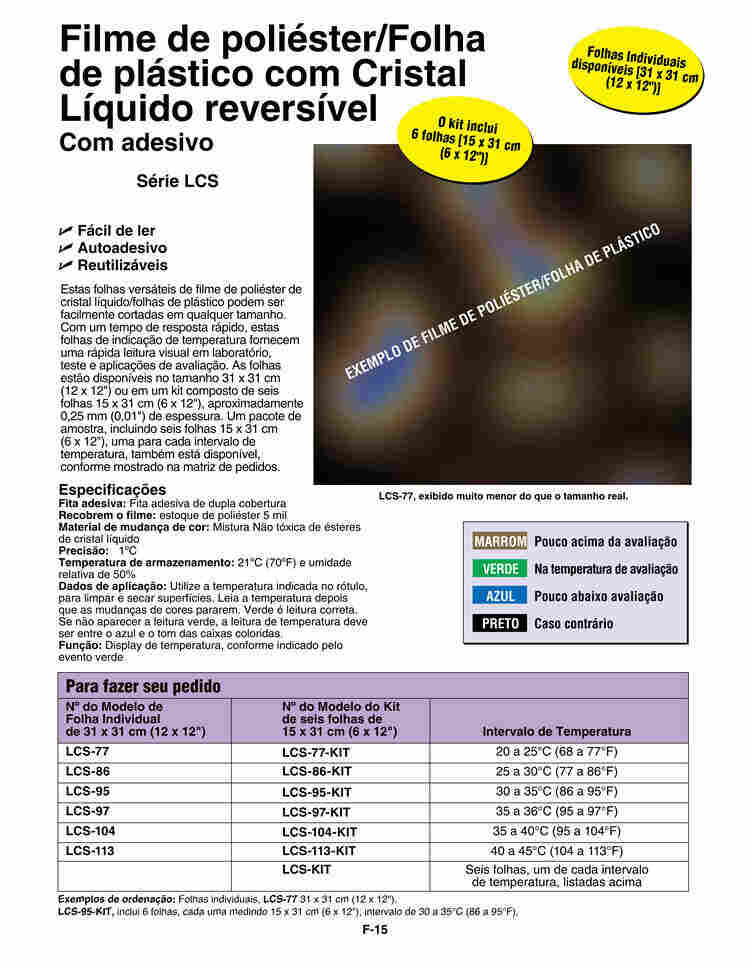 这种多功能液晶聚脂薄膜/塑料片可以轻松切割成任意尺寸。这种温度指示片具有快速的响应时间,可在实验室、测试和评估应用中提供快速的可视读数。可提供的塑料片尺寸为31 x 31 cm (12 x 12"),或作为15 x 31 cm (6 x 12")的六片装套件提供,厚度约为0.25 mm (0.01")。也可提供样品包,内含六片15 x 31 cm (6 x 12")的薄膜,每种温度范围一片,如订购表格所示。