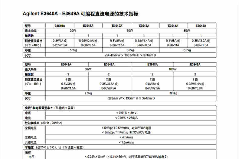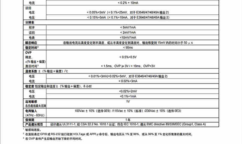 电压:<0.05% + 5 mV(对于 E3646/47/48/49A 的输出 2:<0.1% + 25 mV)
